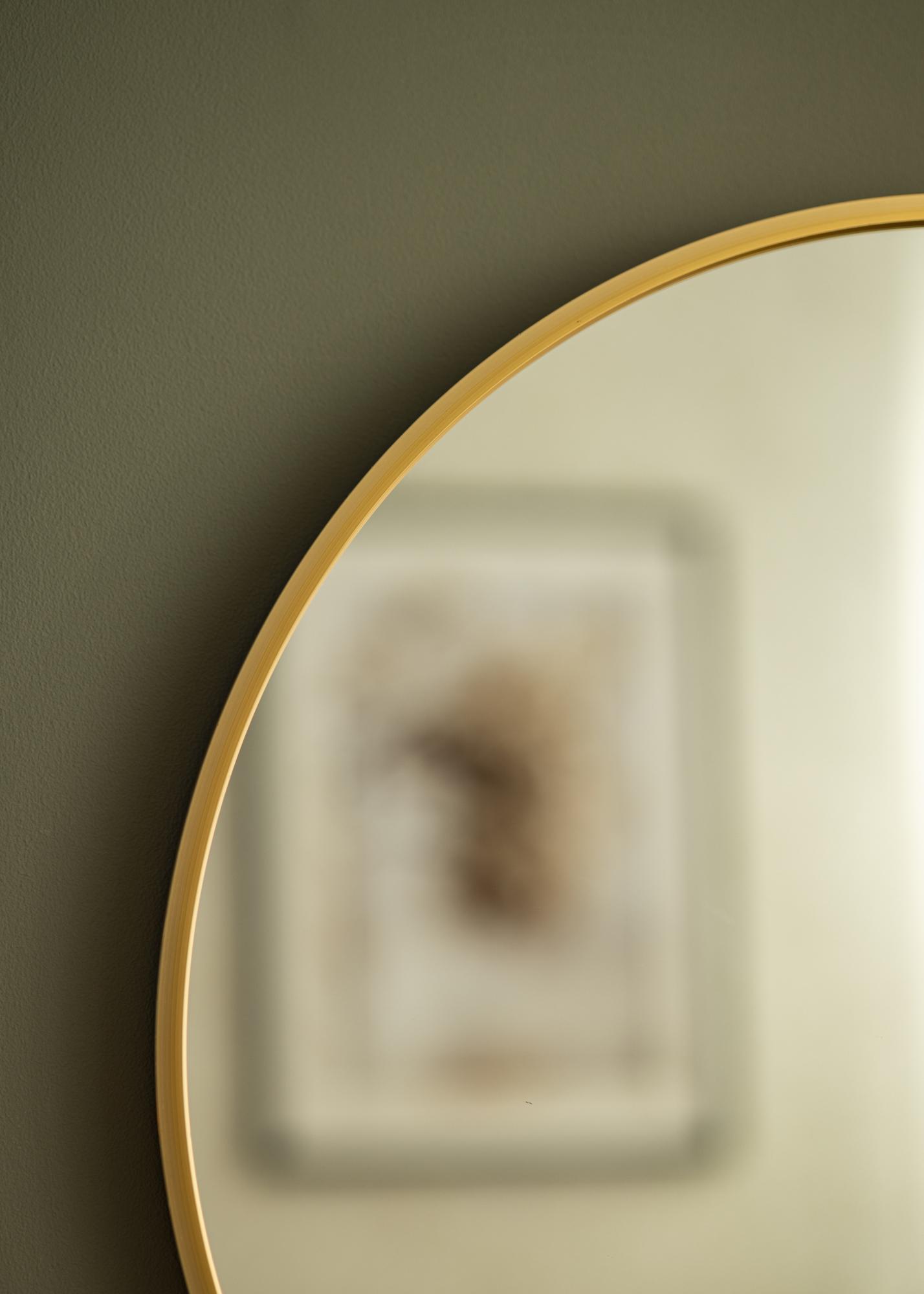 Okruglo ogledalo u elegantnom švedskom dizajnu s metalnim okvirom u prekrasnoj zlatnoj završnici. Okvir ima četkastu površinu, što prekrasnoj zlatnoj boji daje pomalo mat izgled. Okvir je također trendovski tanak, ali ima – ovisno o veličini – dubinu od 30-40 mm, što ga izdvaja od zida i stvara zanimljiv 3D-efekt. Dubina okvira također čini da ogledalo djeluje čvrsto i robusno, bez narušavanja njegove minimalističke senzacije.