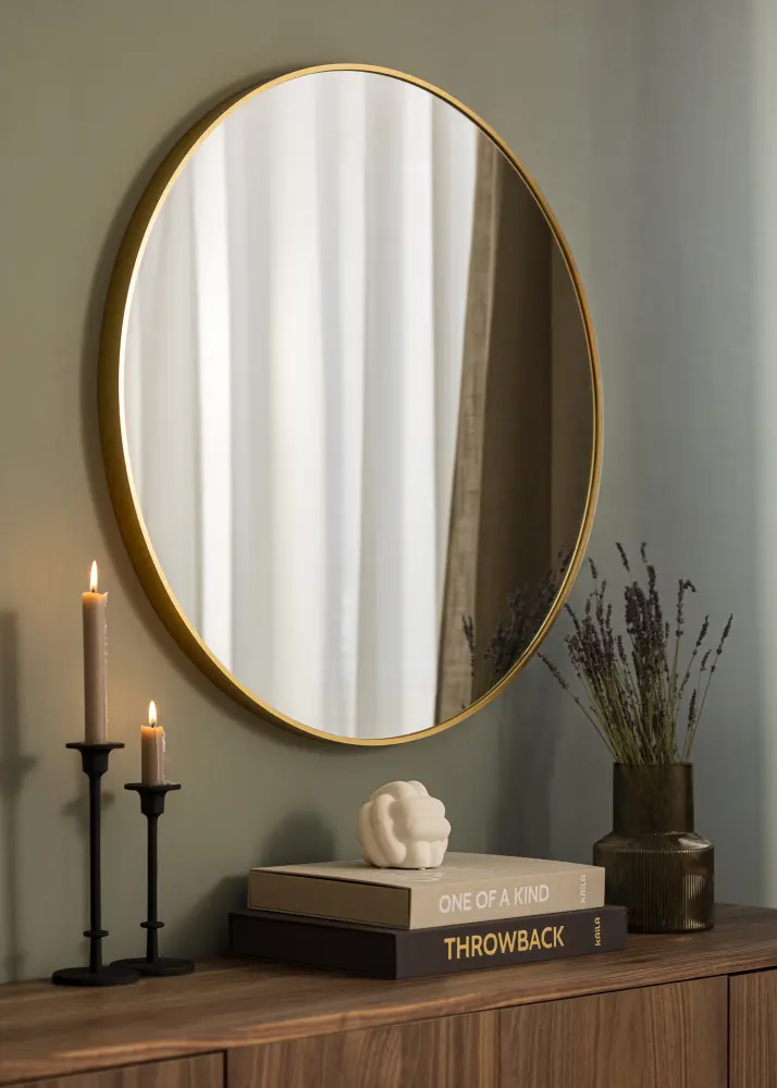 Okruglo ogledalo u elegantnom švedskom dizajnu s metalnim okvirom u prekrasnoj zlatnoj završnici. Okvir ima brušenu površinu, što prekrasnoj zlatnoj boji daje pomalo mat izgled. Okvir je također trendi tanak, ali ima istodobno – ovisno o veličini – dubinu od 30-40 mm, što ga čini izdignutim od zida i stvara upečatljiv 3D efekt. Dubina okvira također čini da ogledalo djeluje solidno i robusno, bez oduzimanja minimalističkog dojma ogledala.