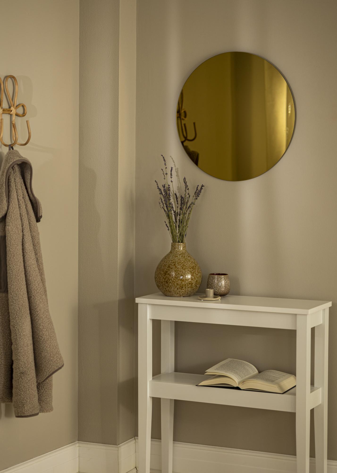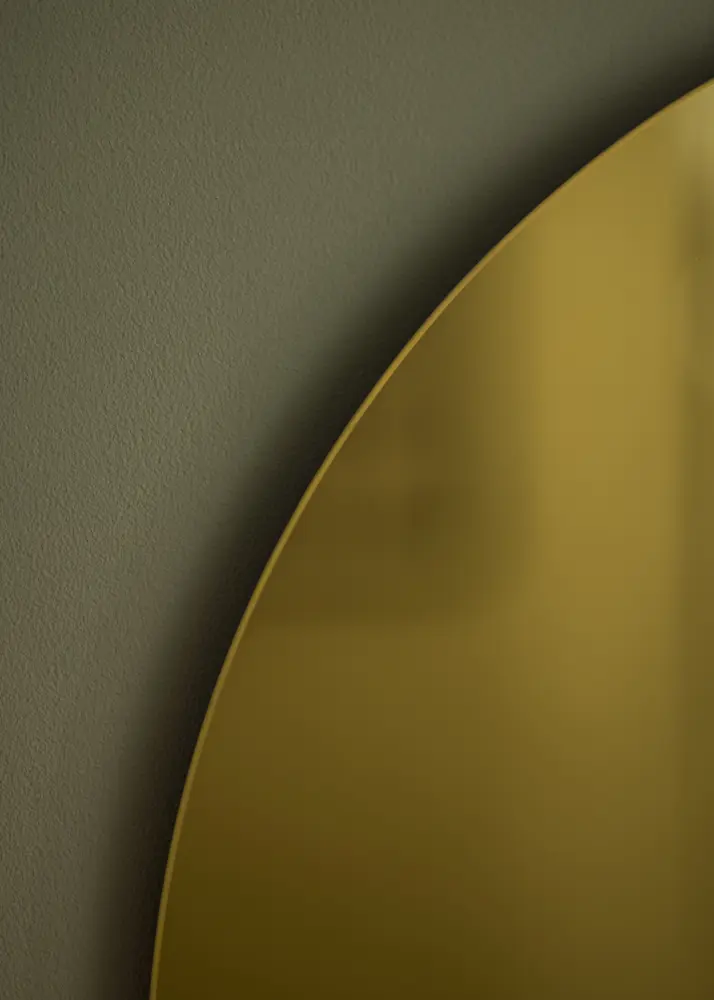 KAILA Okruglo Ogledalo Zlatno savršen je primjer kako dobro može izgledati kada se čist oblik spoji s efektnim detaljima. Ovo okruglo ogledalo je tanko i nema okvir, što mu daje moderan i minimalistički izgled. To se kombinira s prekrasnim zlatnim tonom ogledala koji podiže cjelokupan izgled i čini ogledalo ukusno upadljivim.