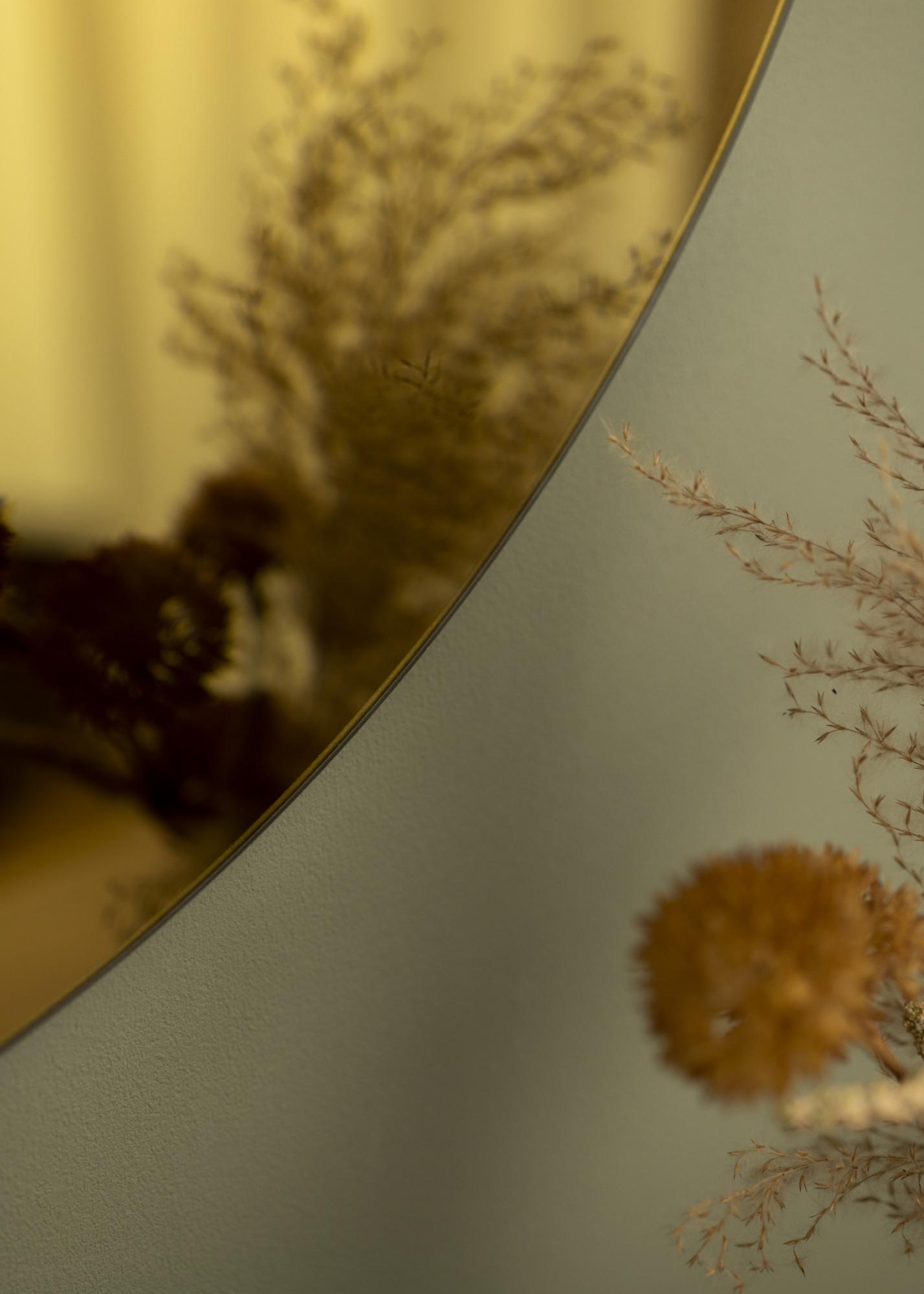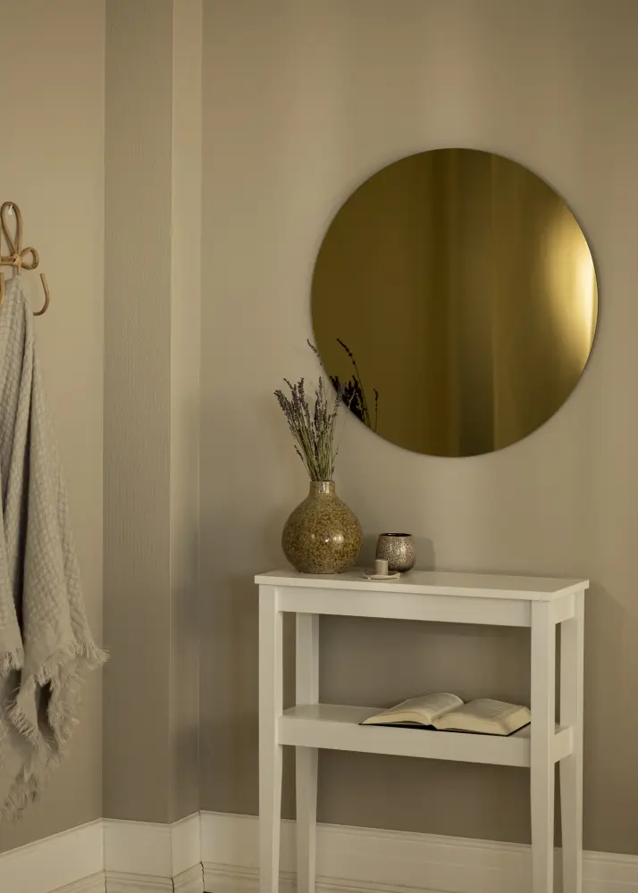 Ovo okruglo ogledalo ima elegantan dizajn s efektnim detaljem; elegantno zrcalno staklo u zlatnoj nijansi. Ovaj detalj daje ogledalu luksuzan izgled, a u kombinaciji s minimalističkim oblikom – tankim i bez okvira – stvara moderan i ukusan cjelokupni dojam.