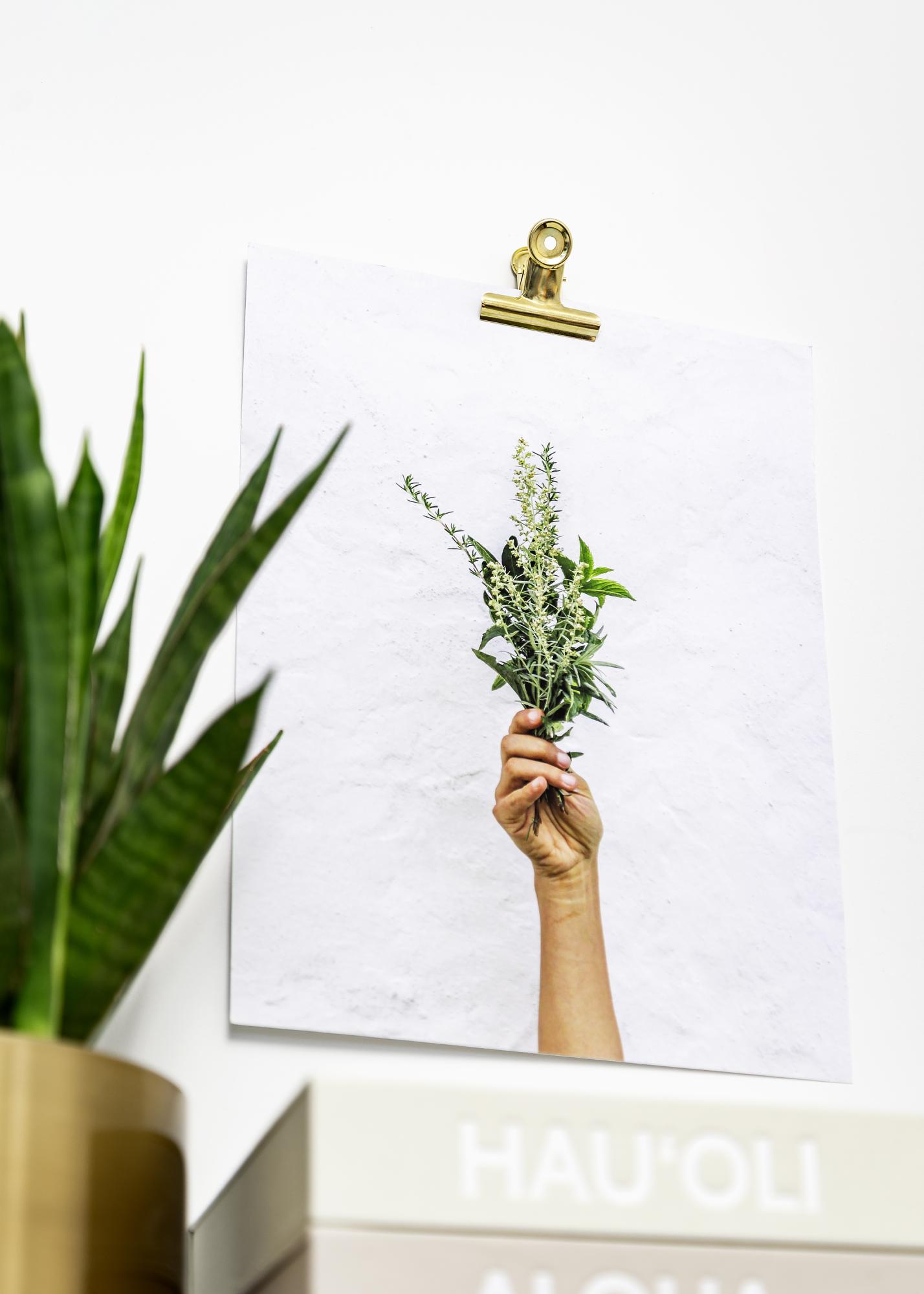 Metanska stezaljka u elegantnom i sjajnom zlatnom finišu koja vašim posterima i printovima daje trendi i minimalistički način vješanja. Dizajn stezaljke je jednostavan, a rupice na okruglom vrhu stezaljke olakšavaju pričvršćivanje na zid pomoću male čavla ili vijka. Otvor stezaljke ima čvrsti hvat koji omogućuje vješanje najtanjih papira, dok je istovremeno fleksibilna i omogućuje montažu motiva različitih debljina. Ako imate veliki poster koji želite objesiti, koristite dvije metalne stezaljke za najbolji rezultat.