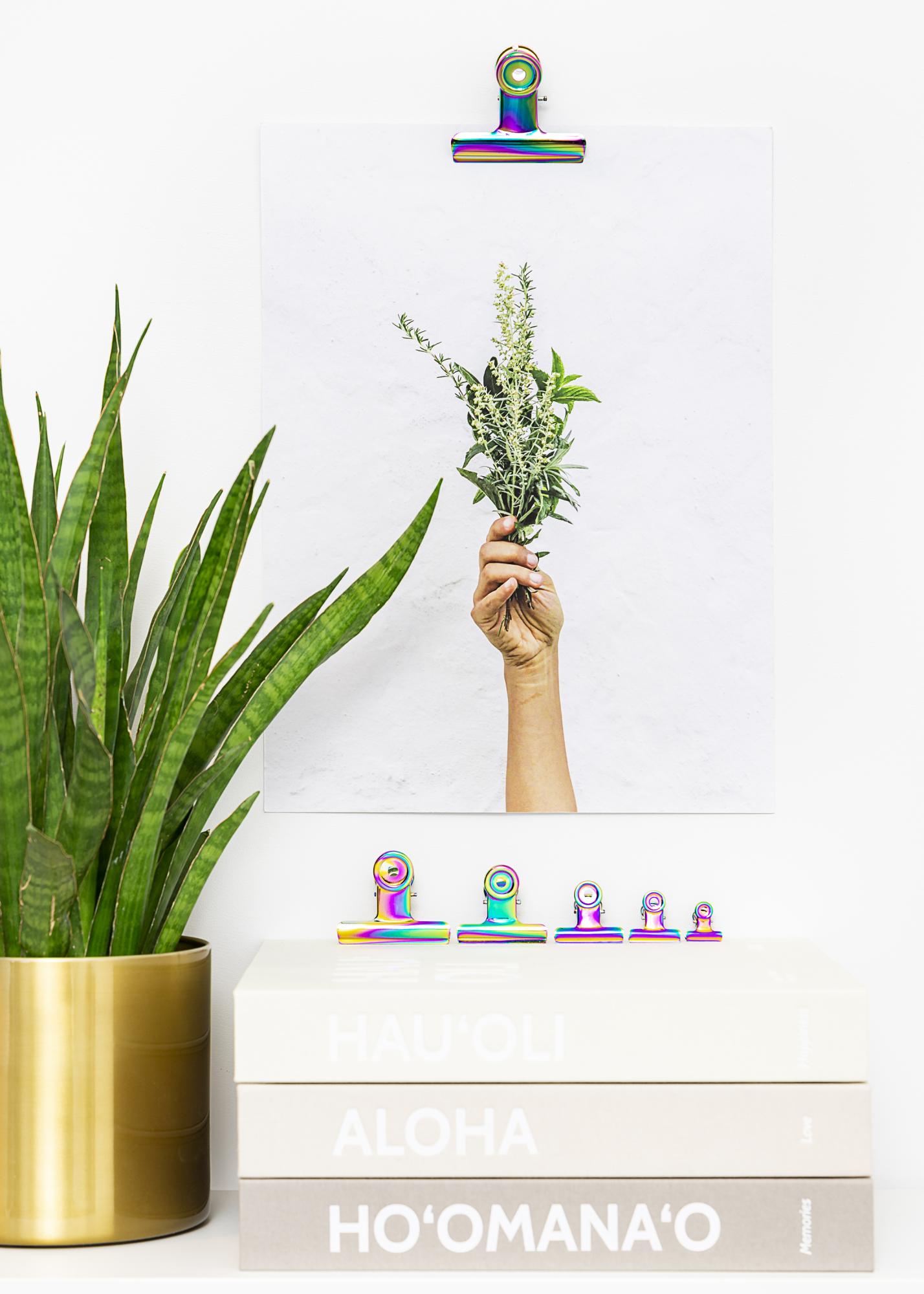 Metalska kopča u raskošnim bojama duge s sjajnim završnim slojem koja vašim posterima i printevima daje trendi i pomalo drugačiji izgled. Jake, ali fleksibilne, čeljusti kopče omogućuju vam da prikačite najtanje papire kao i postere s malo većom debljinom. A ako imate veliki poster koji želite objesiti, jednostavno upotrijebite dvije metalne kopče. Dizajn kopče za postere je elegantan i minimalistički, a zahvaljujući rupicama na okruglom vrhu kopče, lako je objesite na zid uz pomoć malog čavla ili vijka.