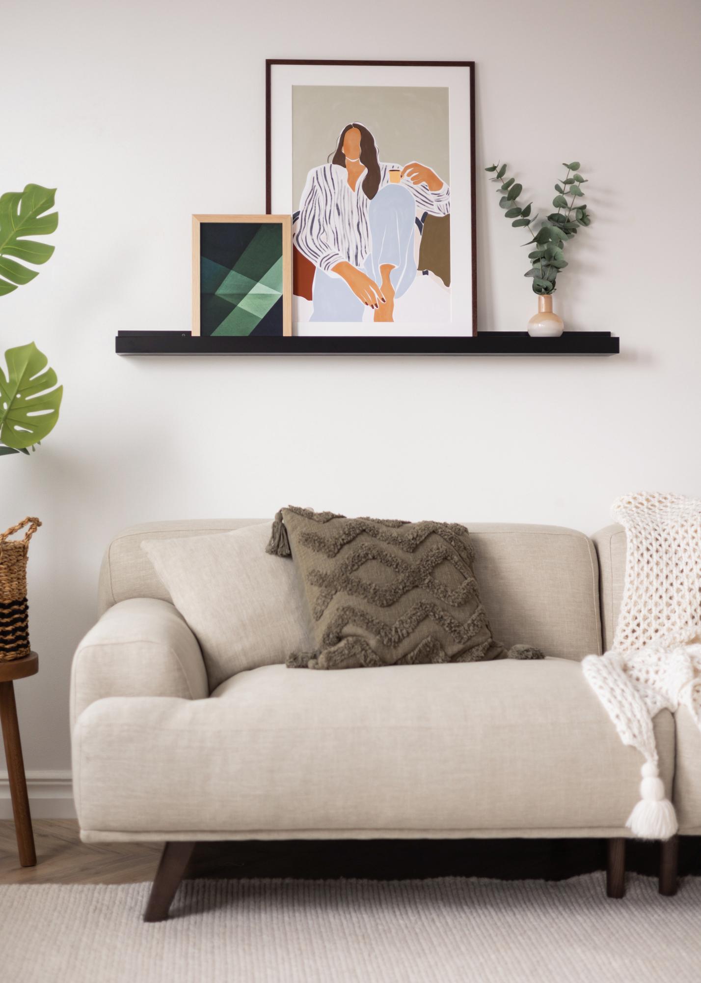 Pokažite i varirajte svoju zidnu umjetnost jednostavno i elegantno s elegantnom policom za slike! Ova polica za slike izrađena je od MDF-a i moderno je obojena u crno s lijepom, polusjajnom površinom. Polica ima elegantan dizajn s ravnim, jednostavnim linijama i minimalističkim dojmom. Površina polica ima utor u sredini koji služi kao potpora za vaše slike i daje im lijepi kut dok su naslonjene na zid.