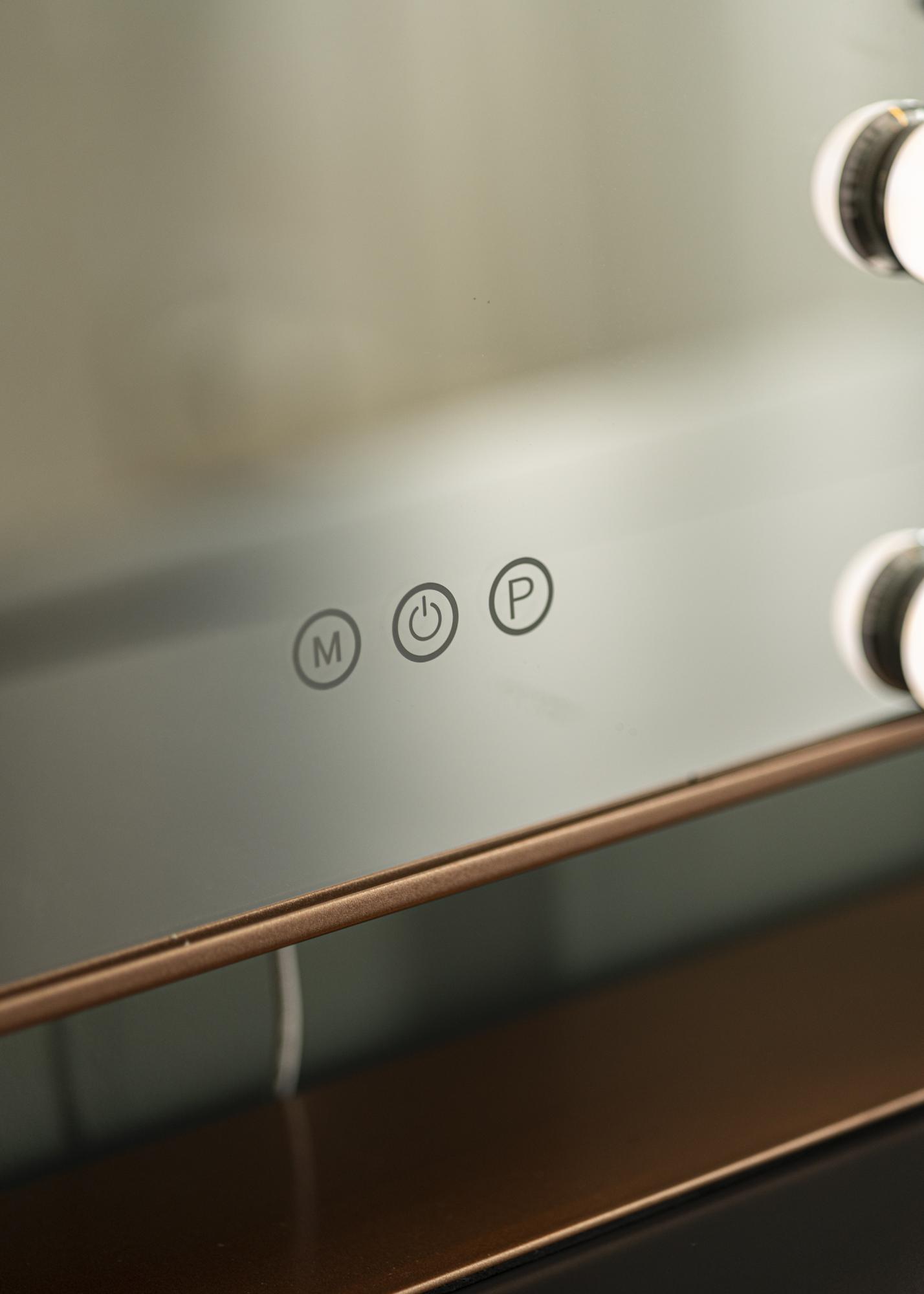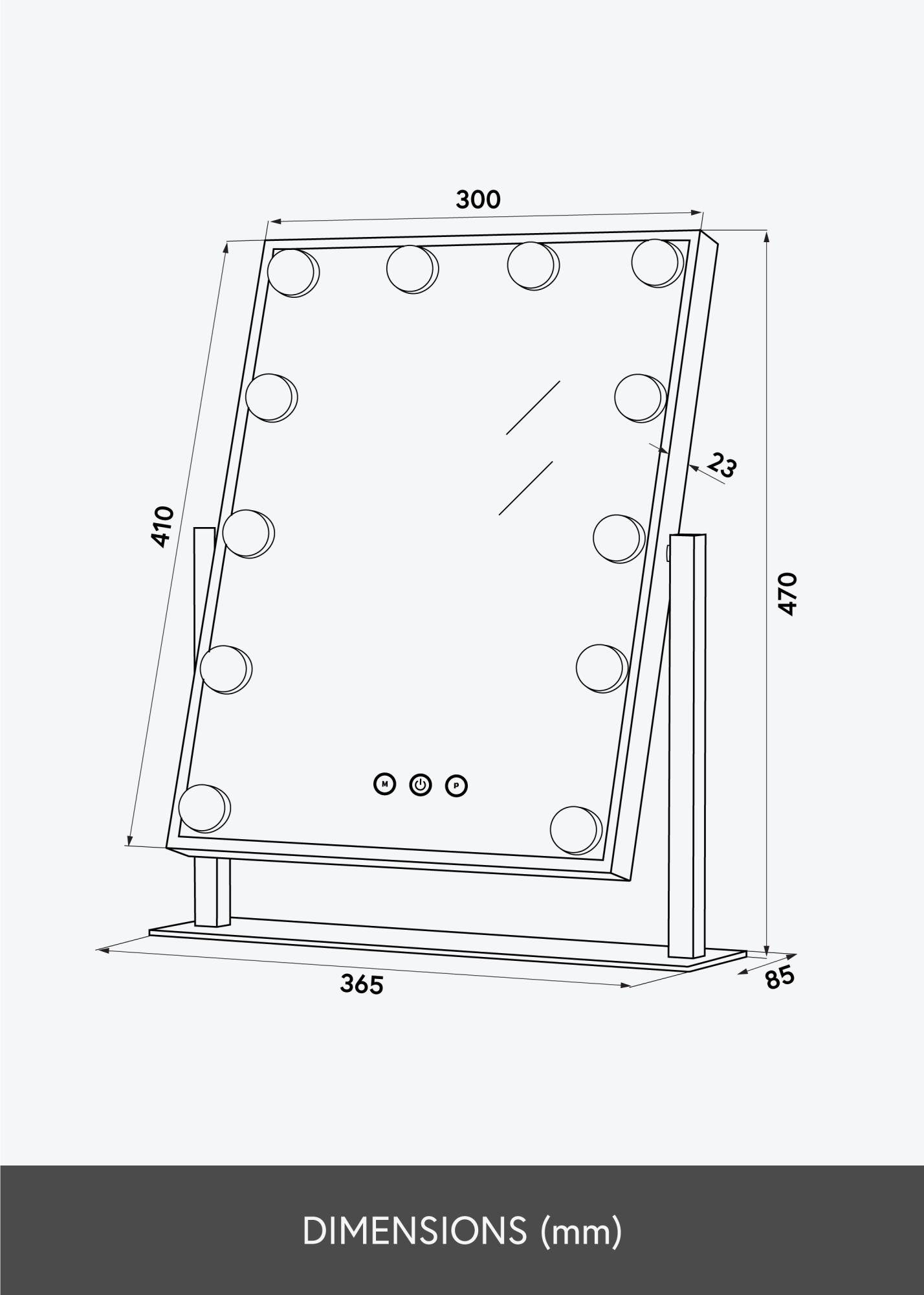 Ovo ogledalo ima LED osvjetljenje u obliku 12 veÄih lampi koje lijepo okružuju povrÅ¡inu ogledala. Ogledalo se ukljuÄuje dodirom na jednu od tipki na prednjoj strani ogledala. Tu su i dodirne tipke za podeÅ¡avanje svjetline i temperature boje. Tipka oznaÄena s ”M” podeÅ¡ava temperaturu boje, a tipka oznaÄena s ”P” postavlja svjetlinu. ElektriÄno povezivanje ogledala vrÅ¡i se preko utikaÄa.