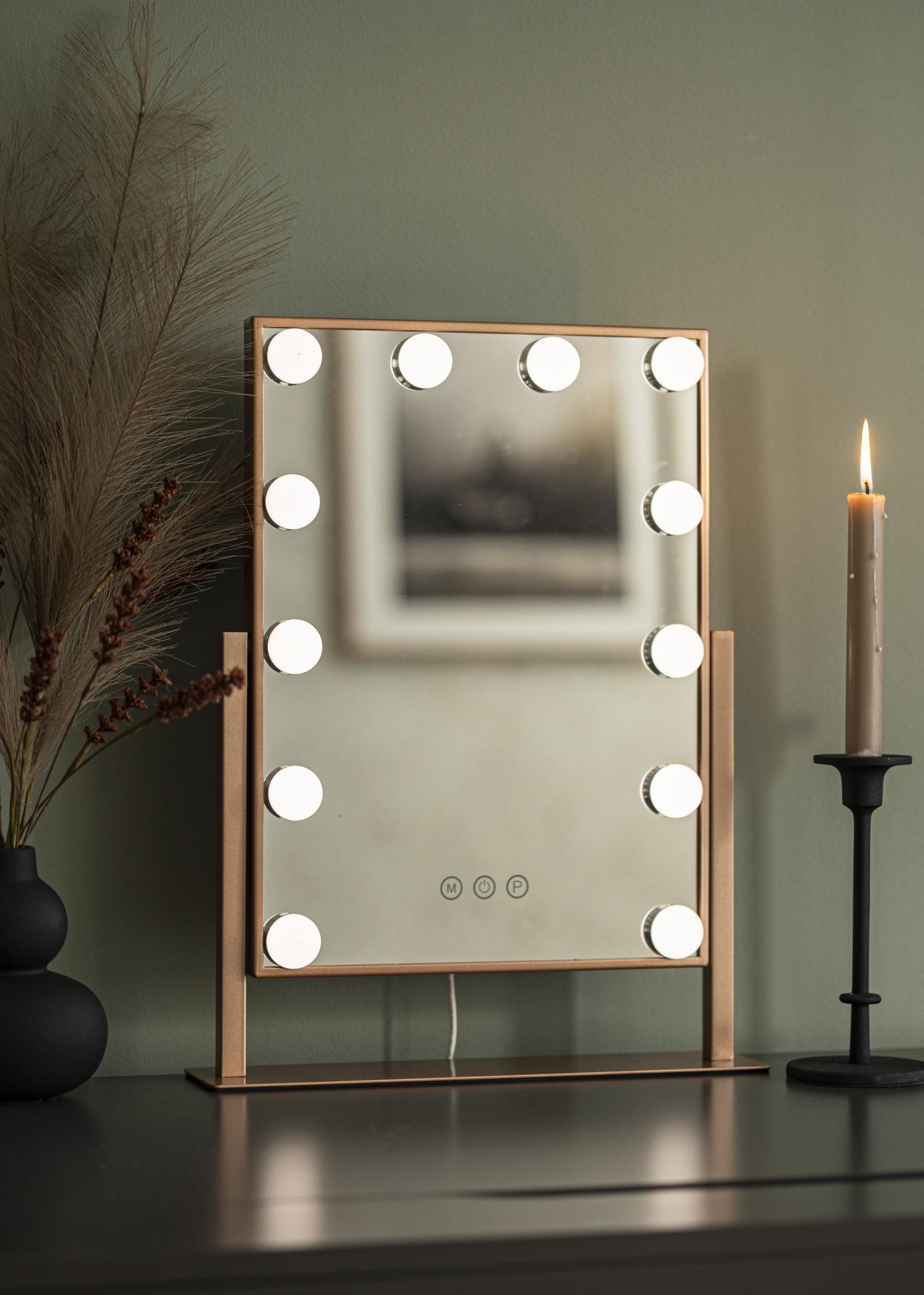 Ovo je elegantno ogledalo za Å¡minkanje s povrÅ¡inom za ogledanje od 30x41 cm, integriranim osvjetljenjem i elegantnom nijansom ružiÄastog zlata. Ogledalo ima modernu podlogu, Å¡to omoguÄuje jednostavno postavljanje na toaletni stol, komodu ili pomoÄni stoliÄ. Ogledalo se može nagnuti radi lakÅ¡eg ogledanja i nanoÅ¡enja Å¡minke.