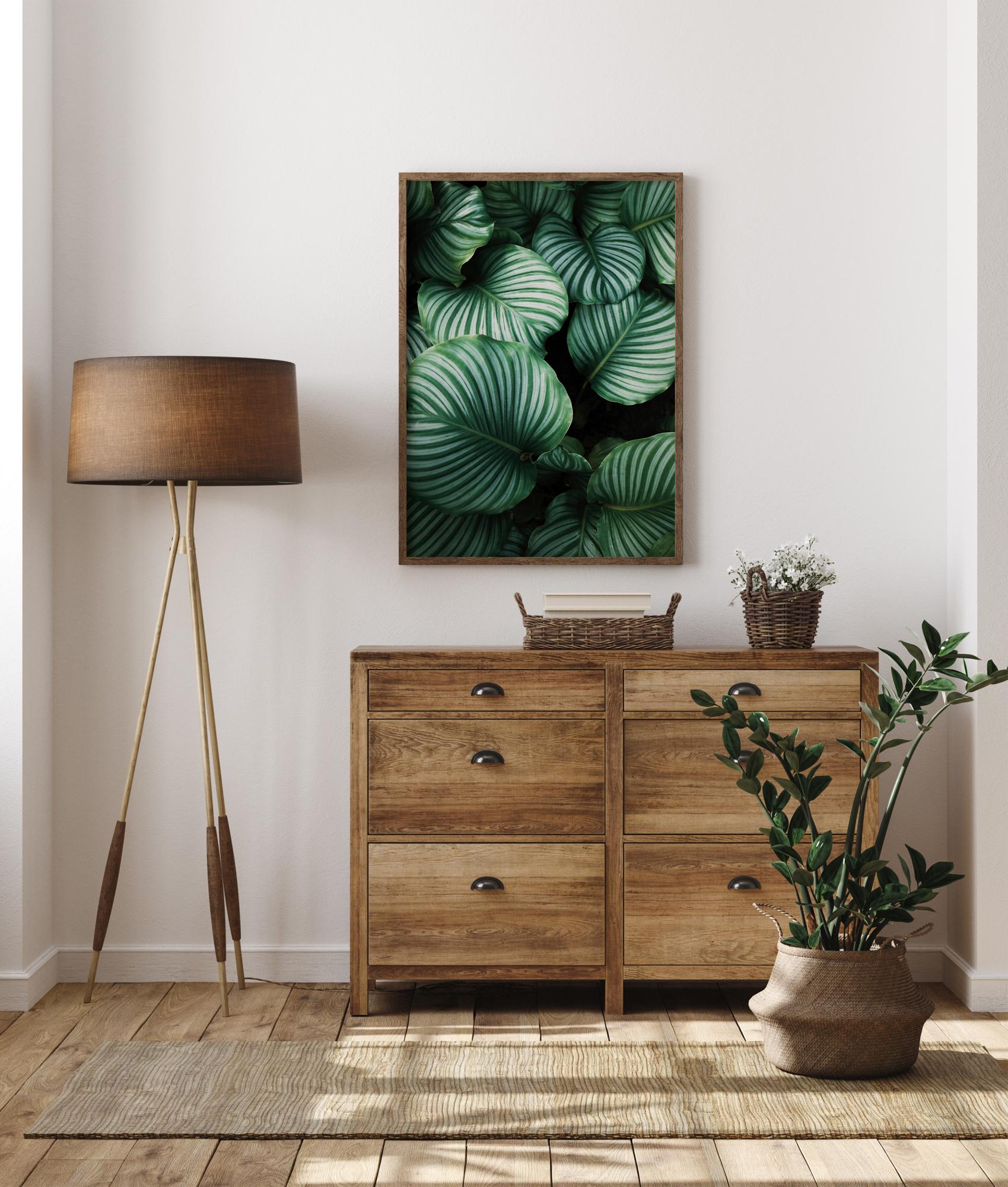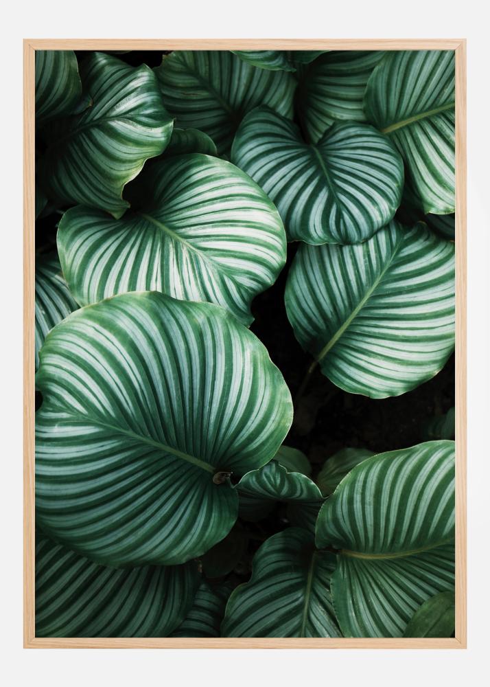 Prekrasan poster iz ptičje perspektive s tamnim, zelenim lišćem kalatee. Sunčeva svjetlost sijeva na lišće i stvara prodornu svjetlost. Različite nijanse zelene stvaraju intenzivno okruženje, što ovu sliku čini savršenom za objesiti okruženu biljkama u dnevnom boravku.