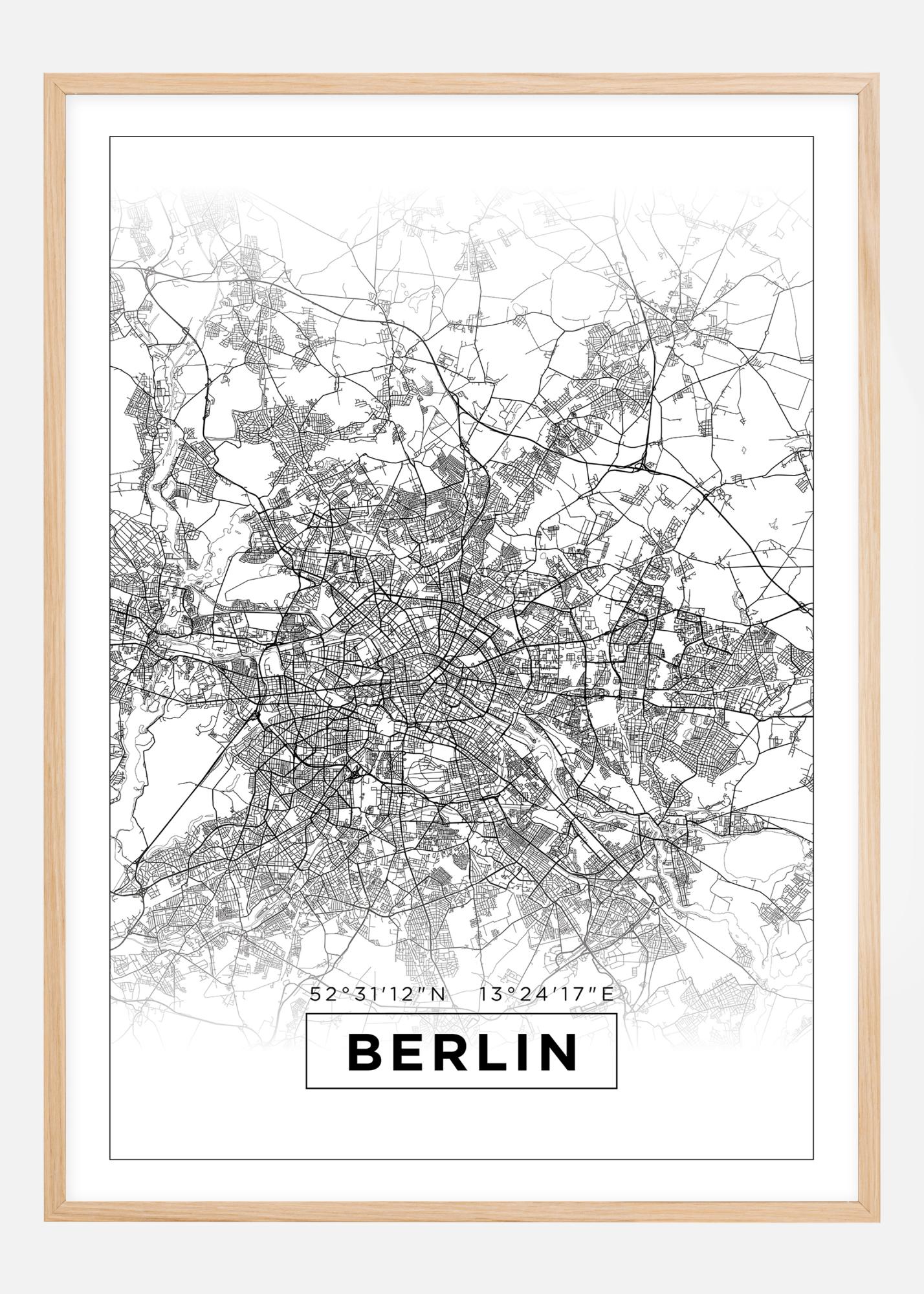 Ovdje vidimo srce Njemačke kako se širi poput cvijeta u crno-bijeloj boji. Karta u uspravnom formatu koja prikazuje cijelu cestovnu mrežu Berlina uokviruje sve gradske ulice i trgove. Na vrhu i dnu slike sve crne linije karte grada izbijaju u bijelo i okružene su tankim crnim okvirom. Na dnu karte piše Berlin velikim slovima, a iznad su koordinate grada; Berlin uokviren poput same karte grada. Motiv je okružen malo širim bijelim rubom koji na lijep način pridonosi privlačenju pogleda na njegov sadržaj. Lijepa i elegantna karta koja lako krasi bilo koji zid!