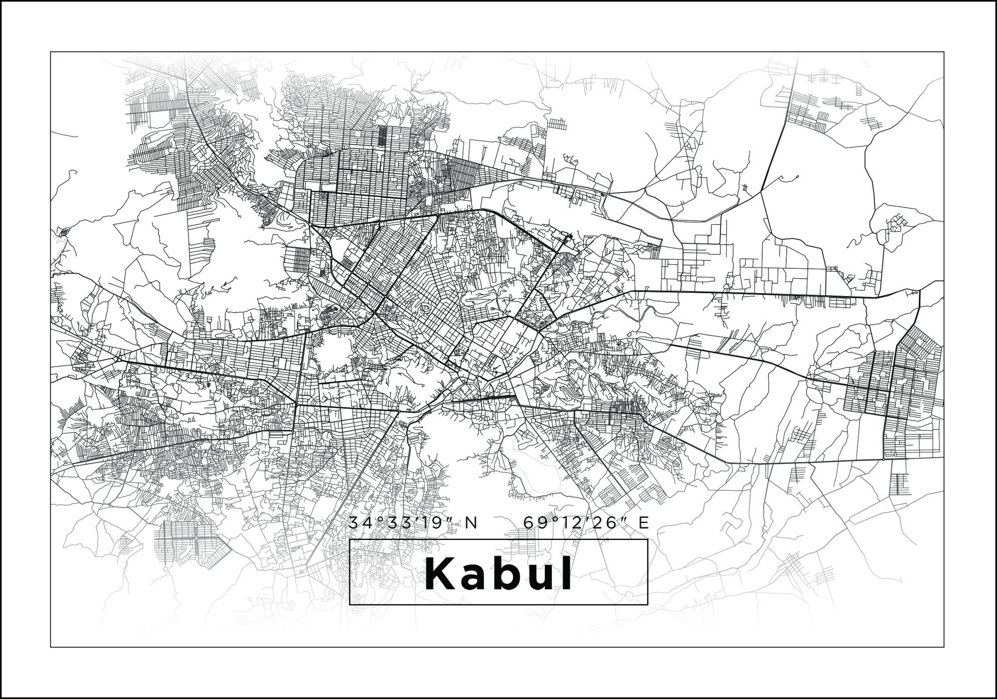 Na ovoj karti grada, predstavljamo vam Kabul u vodoravnom, elegantnom formatu u bijeloj i crnoj boji. Dolje na slici stoji Kabul uokviren crnom bojom, a iznad su koordinate područja. Karta grada okružena je crnim okvirom u istom stilu kao ime, a izvan njega nalazi se malo šira bijela margina. Poster s kartom za one koji vole elegantan i čist izraz u svom domu!