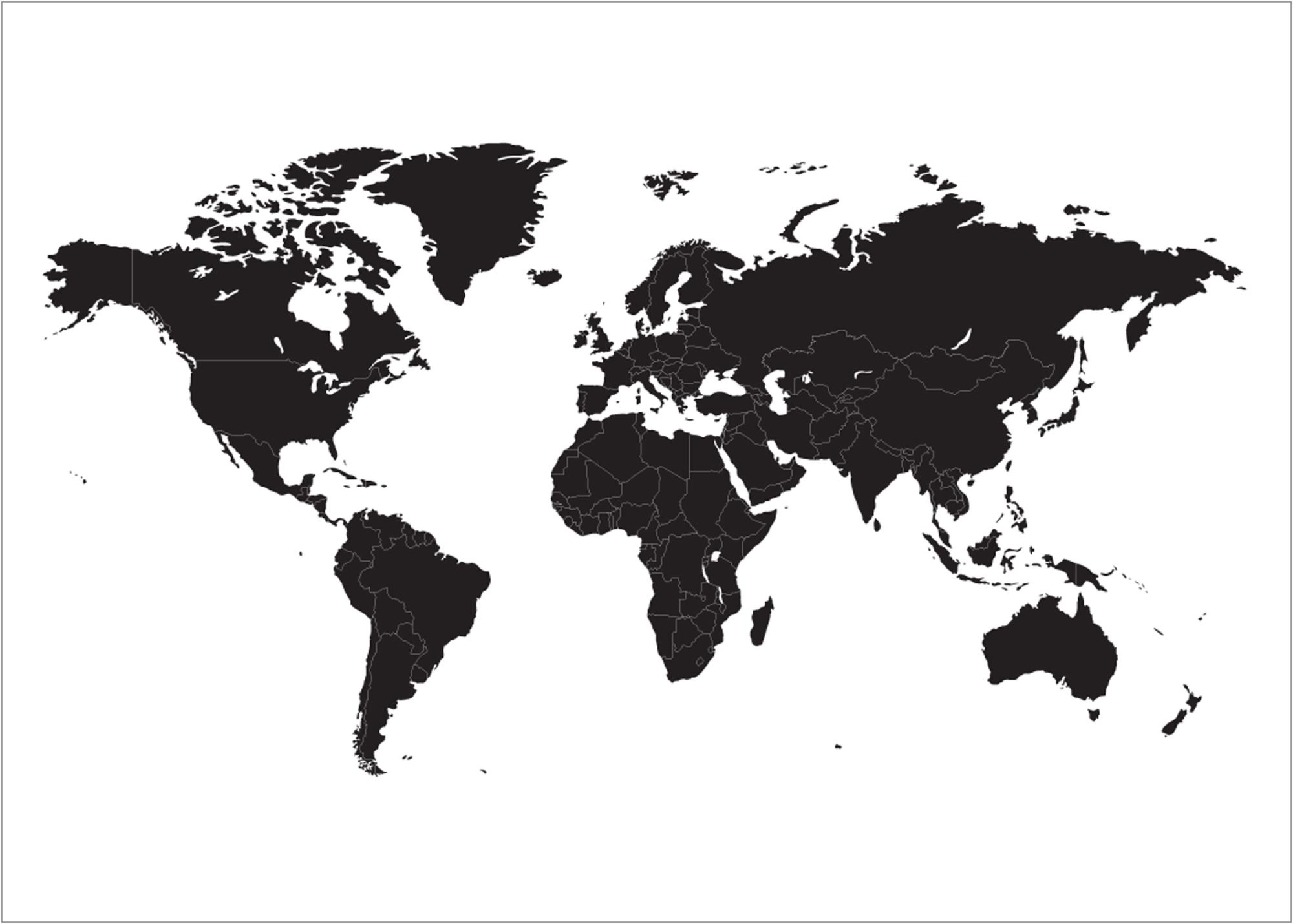 Elegantna crno-bijela karta svijeta s kontinentima u crnoj boji gdje su zemlje označene tankim bijelim linijama. Grafički poster jednako dobro odgovara u modernim minimalističkim okruženjima kao i u uređenju s klasičnim namještajem. Odaberite lijep okvir koji odgovara ostatku interijera kako bi se slika uklopila u cjelokupnu estetiku ili uokvirite kartu okvirom koji zaista ističe motiv i čini ga upečatljivim na zidu.