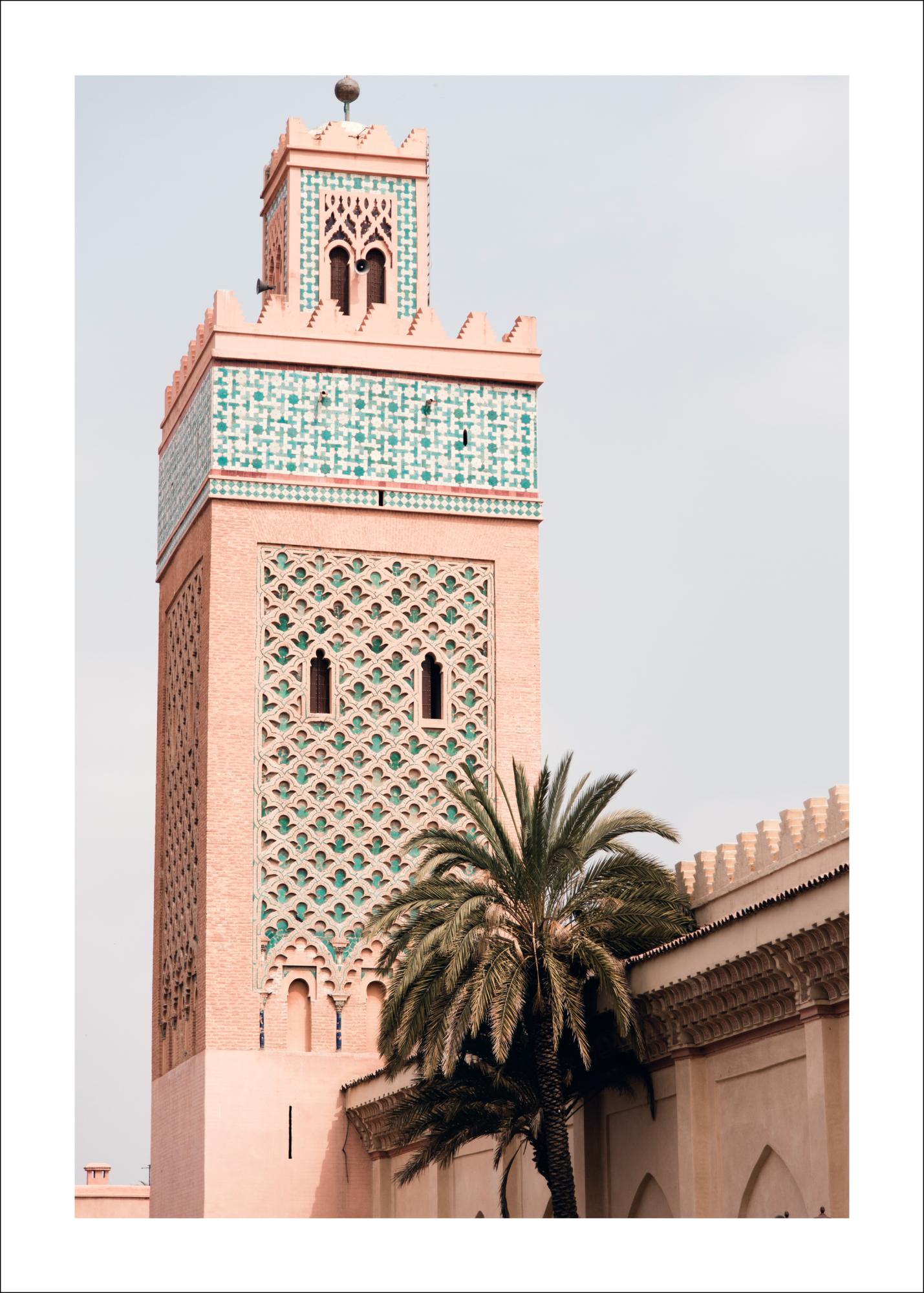 Plakat s džamijom Kutubija u Marrakechu tijekom dana. Prekrasne boje breskve i tirkiza savršeno se stapaju s svijetloplavim nebom. Na dnu slike stoji usamljena palma sa svojim granama, koje pokrivaju donji dio krova džamije. Ova kamenita struktura boje breskve stvara osjećaj mira.