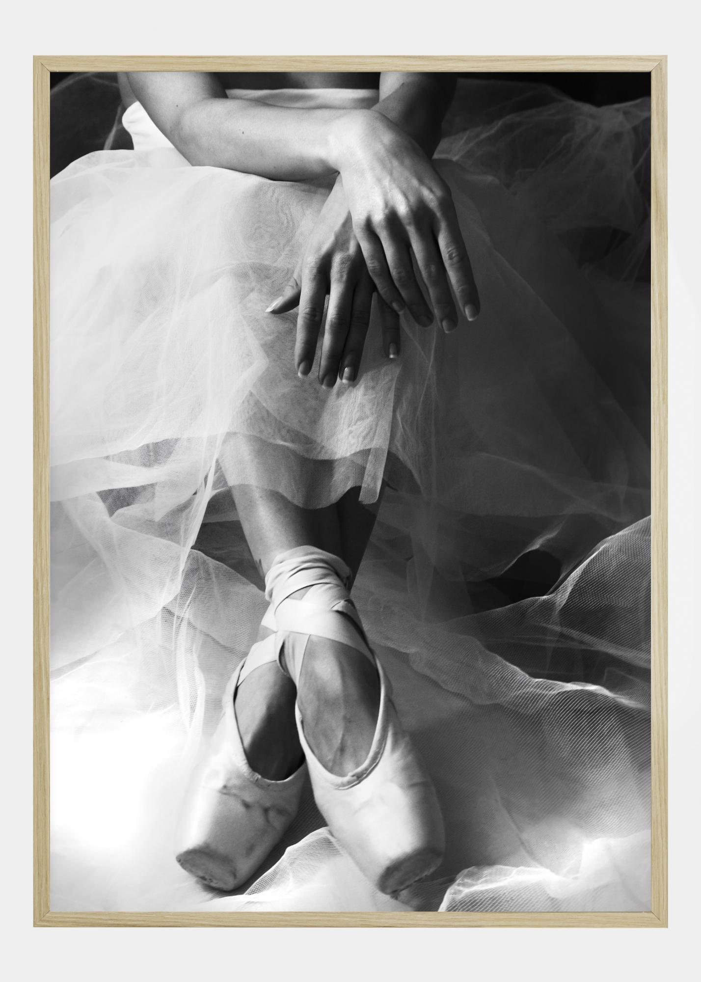 Elegantni poster s balerinom koja sjedi prije plesa. Slijedite prekrižene noge i ruke dok čeka svoj red. Ovaj poster savršeno odgovara na neutralni zid.