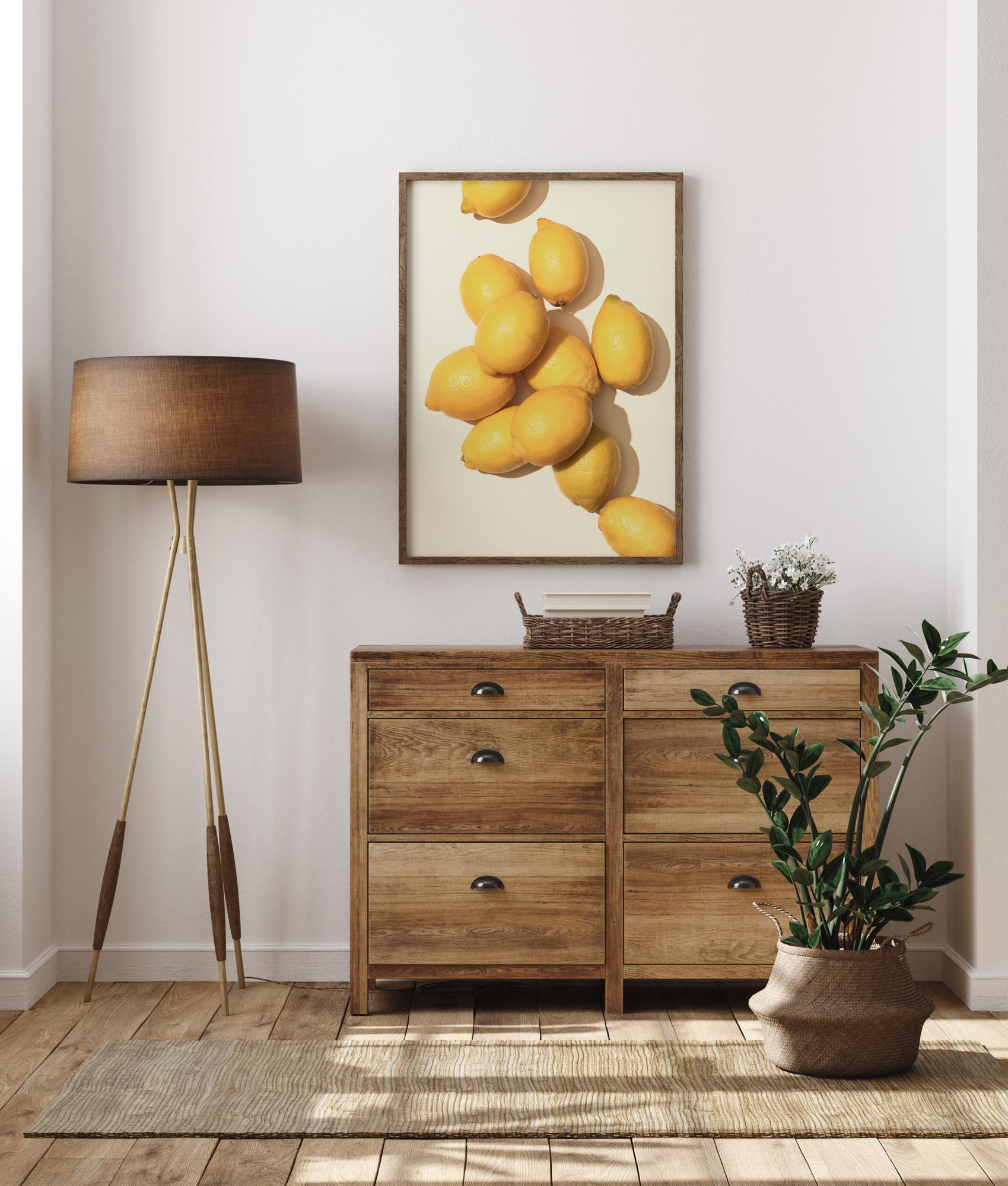 Realističan poster s limunima. Svjetlo odozgo projicira se izravno na voće što naglašava hrapavost kore. Svjetlo stvara sjene koje se protežu preko bijele pozadine. Osjetite miris svježine ovog citrusa dok vješate ovaj tisak u svojoj kuhinji.