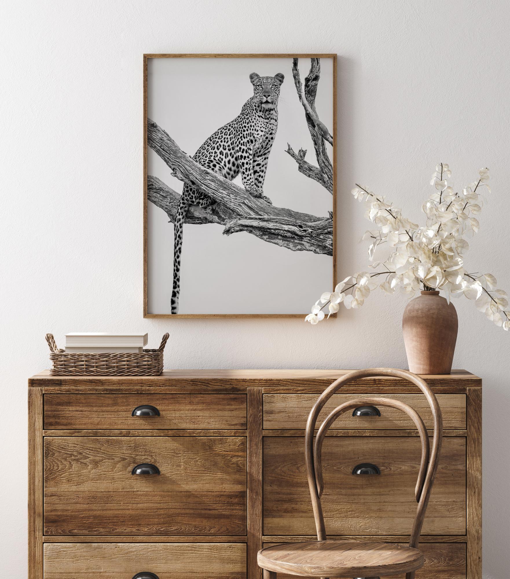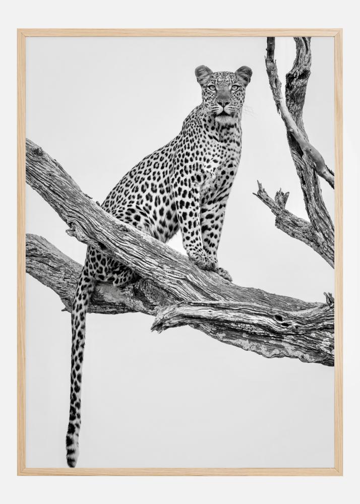 Prirodni poster s leopardom koji sjedi na grani drveta. Leopard gleda daleko i stvara osjećaj da će se nešto dogoditi. Osjetite iščekivanje s ovim tiskom.