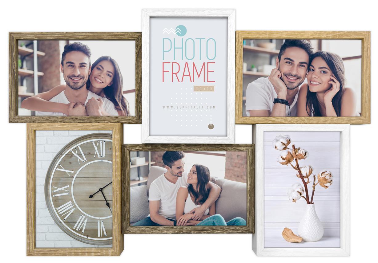 Elegantna kolažna okviri izrađena od drva. Okvir dolazi u nekoliko različitih nijansi, ali ipak ima elegantan dizajn s tankim okvirima u prirodnim tonovima. Zašto ne biste skupili svojih 6 najljepših foto uspomena i ovjekovječili ih u ovom okviru kako biste uvijek mogli gledati unatrag na njih! Ovaj kolažni okvir sadrži 6 motiva dimenzija 13x15 cm. Zidni nosač je uključen.