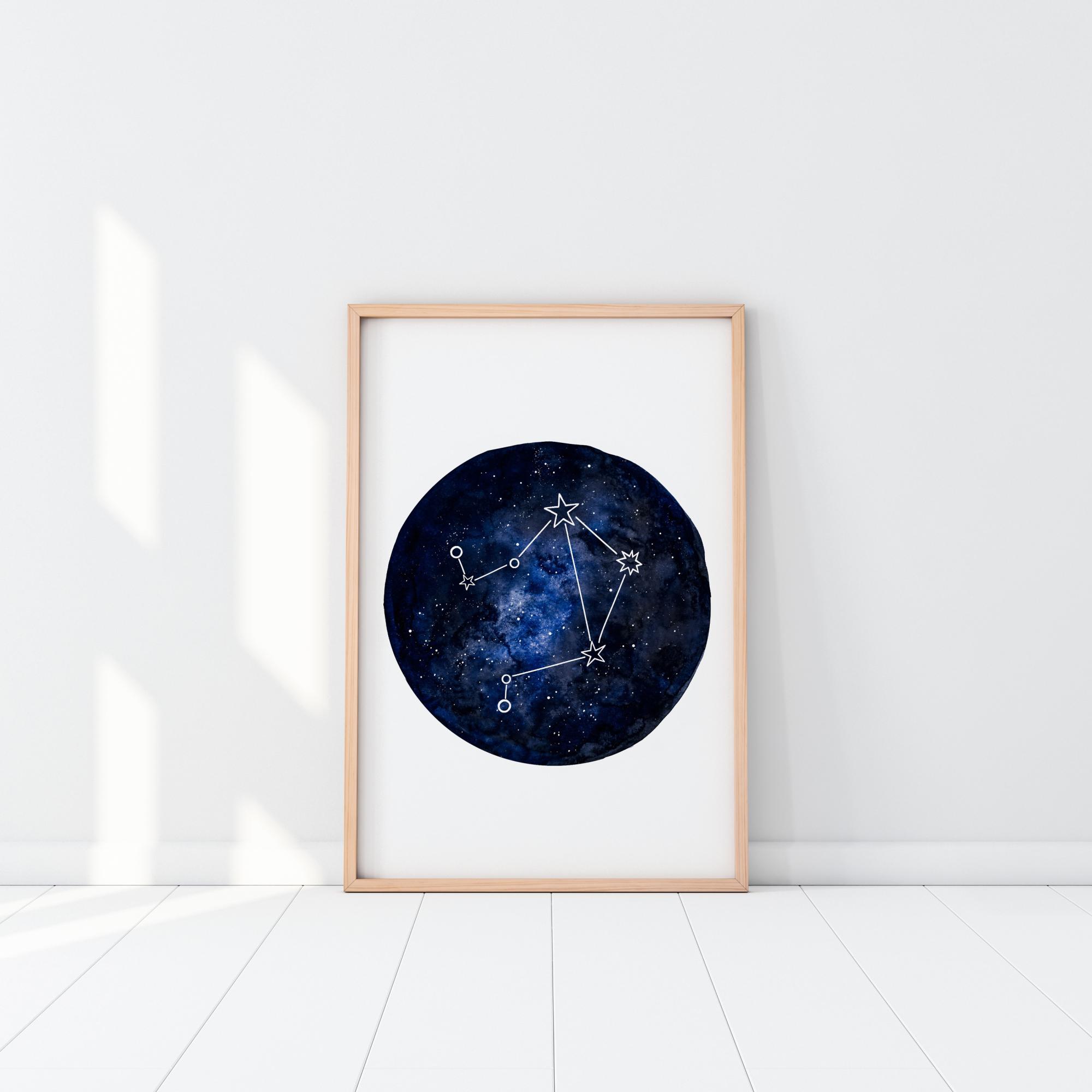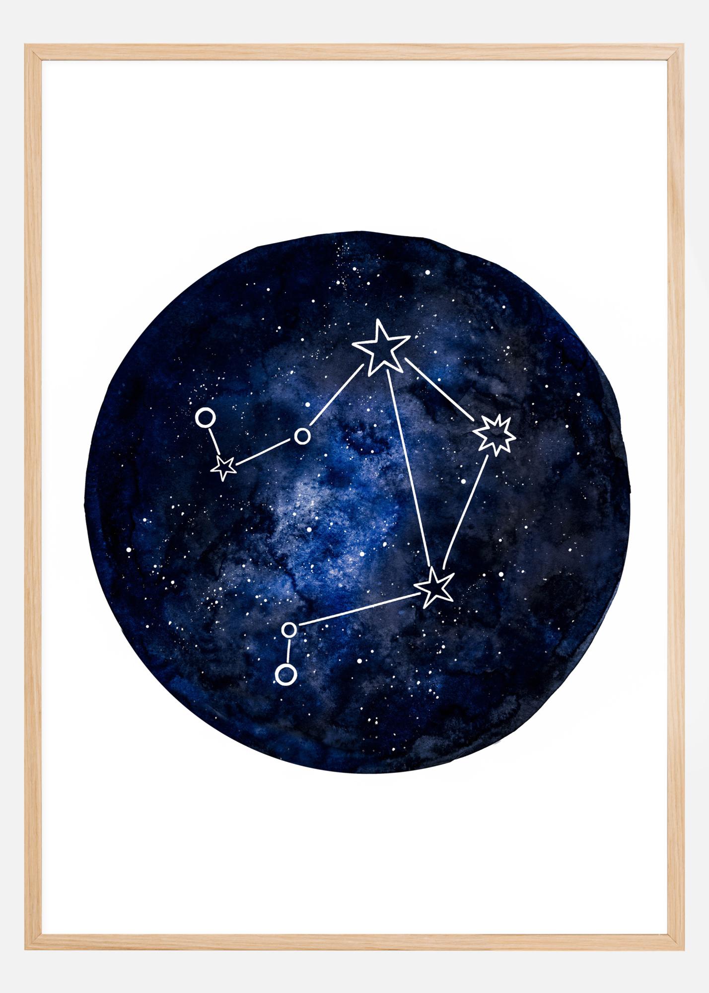 Mala astrologska karta zviježđa Vage. Tamnoplava karta nalazi se na jednostavnoj bijeloj pozadini i istaknuta je bijelim crtama koje pokazuju zviježđe Vage. Poster koji je idealan poklon za sve rođene u ovom zvjezdanom znaku.
