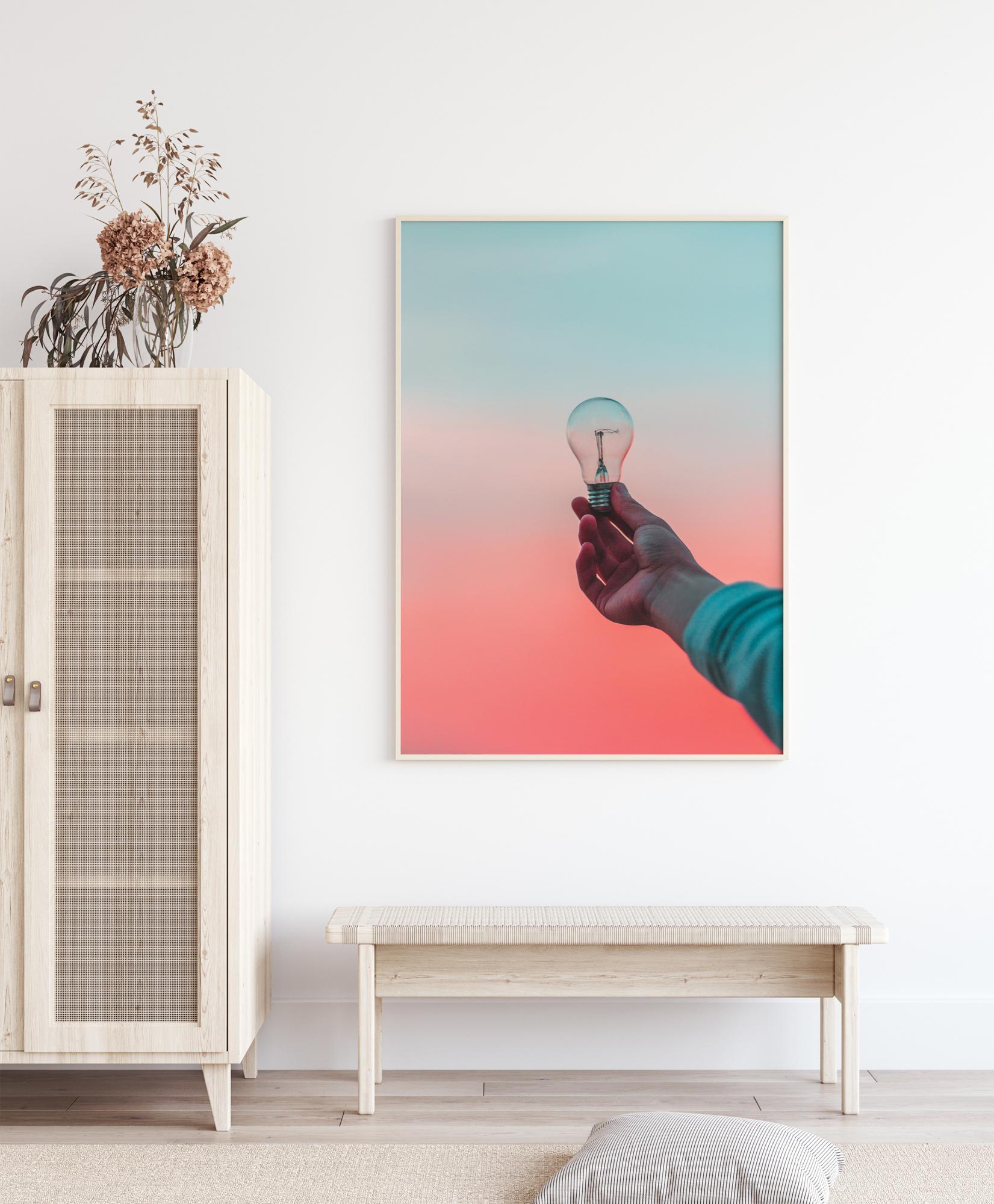 Jednostavan otisak žarulje koja se drži prema nebu. Prekrasno svijetloplavo nebo naglašava tirkizni džemper osobe koja drži žarulju. Donji dio postera reflektira prekrasnu ružičastu nijansu koja se odražava u žarulji. Smirujući otisak koji bi izgledao lijepo na zidu u pastelnim bojama.