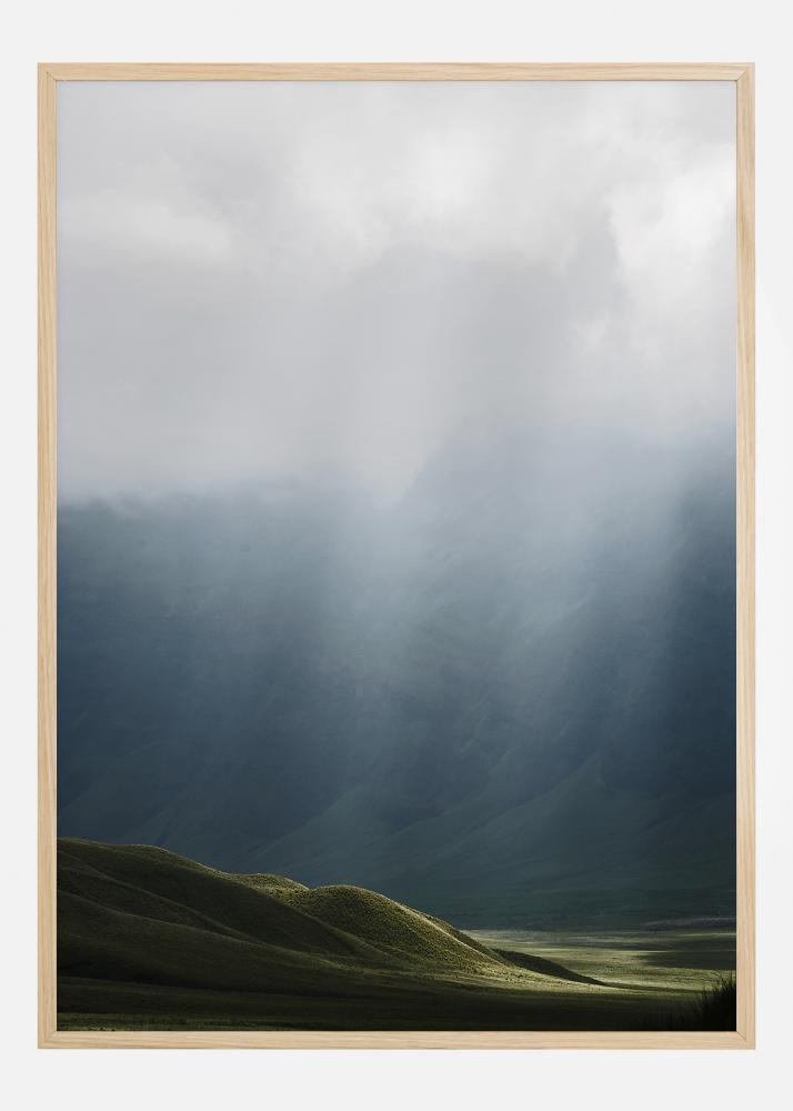 Prekrasan plakat s krajolikom tamnozelenih brežuljaka u prvom planu. Visoka brda na drugoj strani jedva su vidljiva zbog rane jutarnje magle. Blage zelene i sive boje stvaraju umirujući i opuštajući osjećaj. Savršen ispis za objesiti u dnevnom boravku.