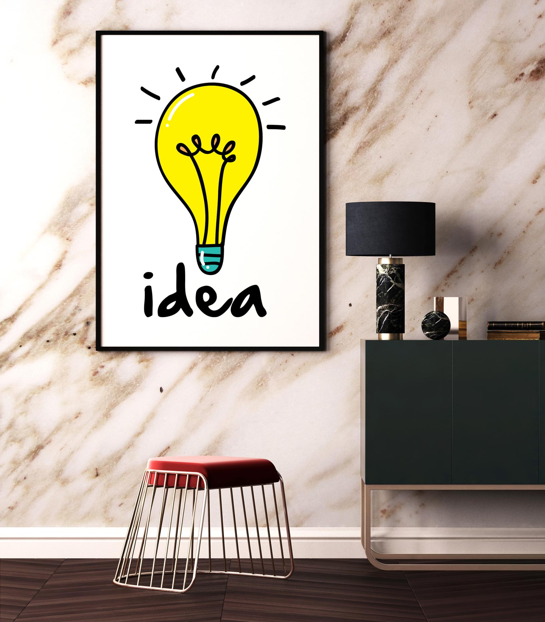 Poznajete li nekoga tko je uvijek pun ludih ideja? Evo savršenog poklona za genijalca. Poster, s ilustracijom upaljene žarulje i riječju idea na engleskom, ima dojam stripa i odlično se uklapa s ostalim grafičkim ispisima u istom stilu. Dopunite poster elegantnim crnim okvirom za slike s tanjim profilom koji naglašava motiv i pojačava naivni osjećaj slike.