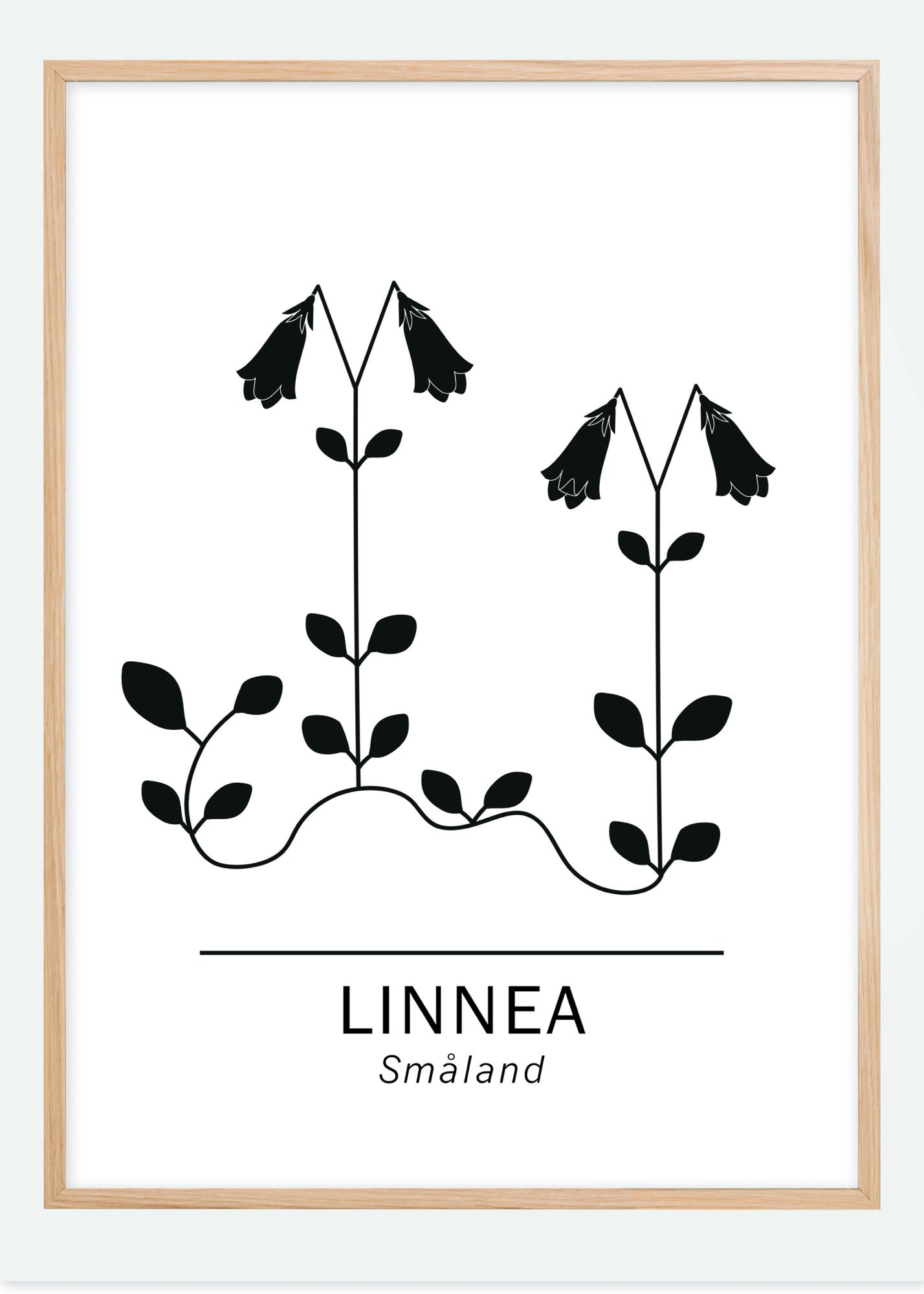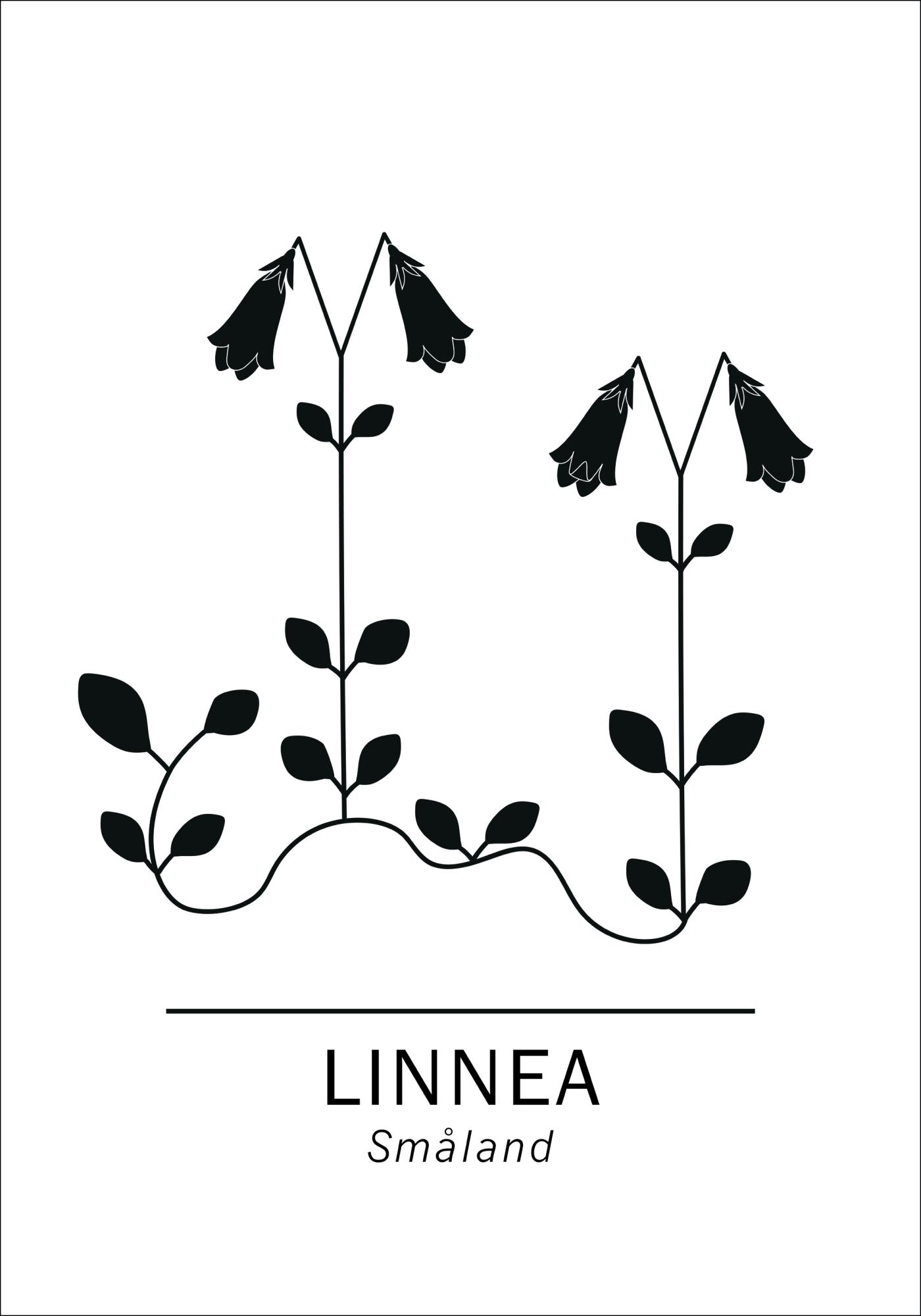 Prekrasna crno-bijela minimalistička slika u crno-bijeloj boji s dva crna Linnea. Ispod cvjetova nalazi se valoviti red listova koji povezuje dvije stabljike i tekst ”Linnea, Småland”. Skromna, ali elegantna slika koja stvara osjećaj jednostavnosti. Objesite ovaj poster na obični bijeli zid kako biste stvorili umjetnički izgled.