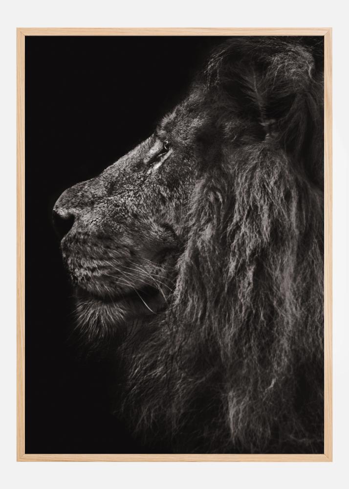 Veličanstveni crno-bijeli print s lavom koji gleda ulijevo na printu. Na crnoj pozadini nježna svjetlost ističe lavlji nos i obraze. Sa svojim dugim, gustim krznom, ovo fantastično stvorenje čeka svoj plijen u tišini. Savršeni poster za sve koji vole velike divlje mačke.