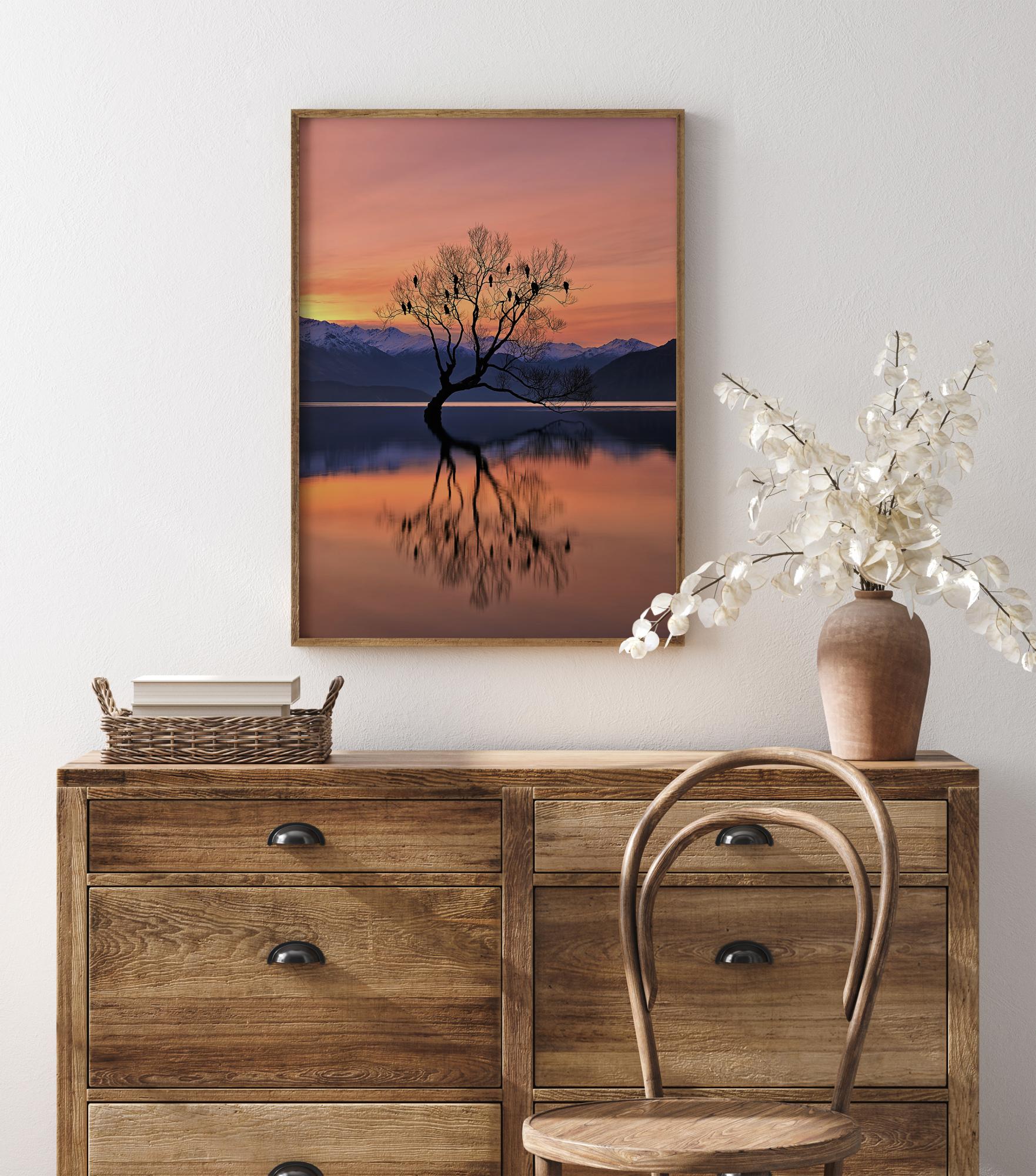 Lijepi plakat prirode s osamljenim drvetom usred jezera. S pticama koje mirno sjede na granama, ovaj pastelni ispis odražava drvo u jezeru i stvara savršen zrcalni efekt prirode i boja. Čujte tišinu na ovoj umirujućoj slici.