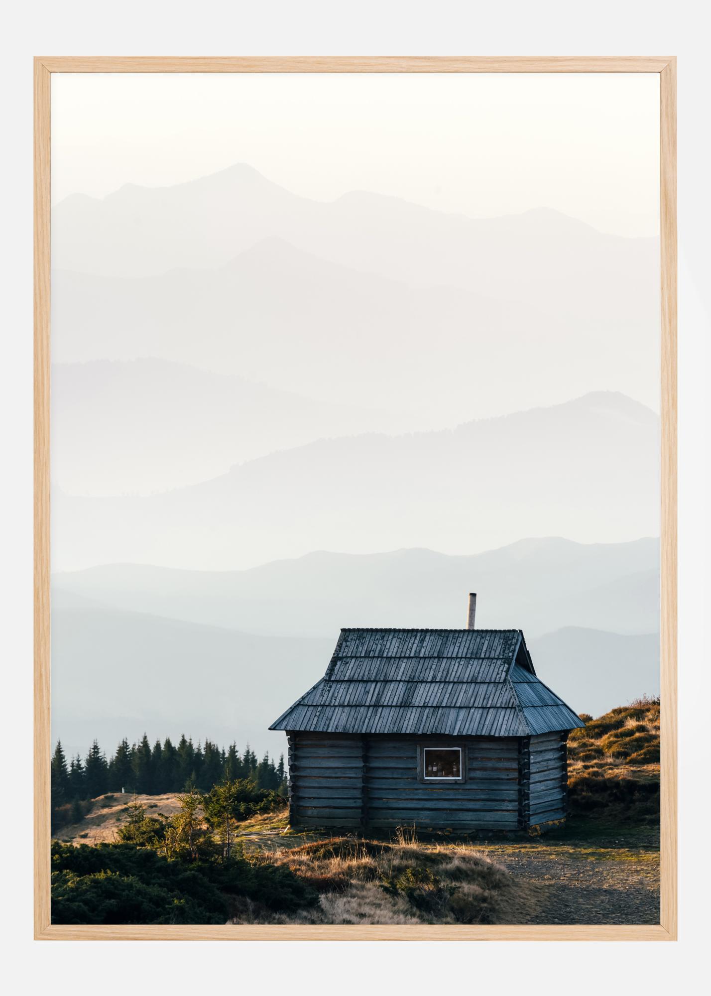 Jednostavna, mala plava kućica na vrhu planine. Udaljena brda u maglovitoj pozadini stvaraju magičnu sliku. Lijevo od kućice tamnozelene jelke dodaju dodatnu boju ovom jednostavnom ali lijepom posteru. Objesite ga na svijetli zid kako biste stvorili osjećaj prostora.
