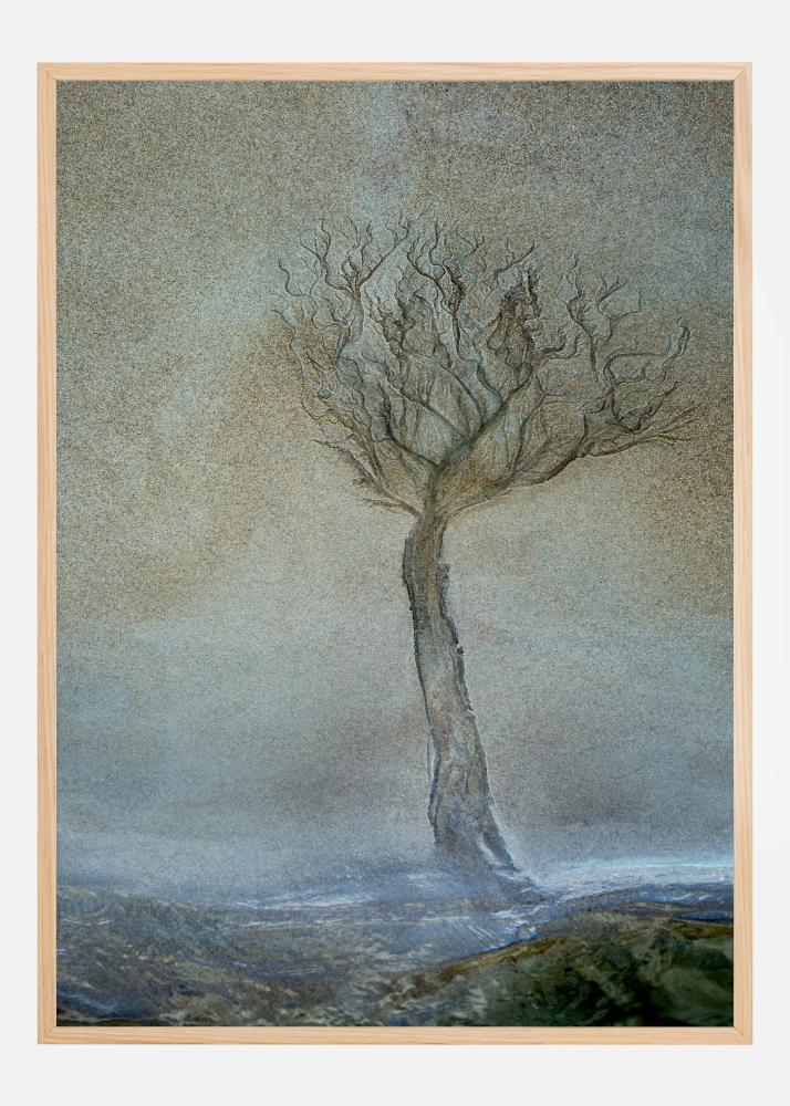 Plakat s krajolikom s melankoličnim osamljenim stablom. Tisak prikazuje blijedi panoramski pogled na ravnice s brežuljcima u prvom planu. Usamljeno drvo bez lišća dominira prednjim planom. Mekane sive i smeđe boje stvaraju melankoličan i izgubljen osjećaj. Objesite ovaj tisak u mirnom prostoru.
