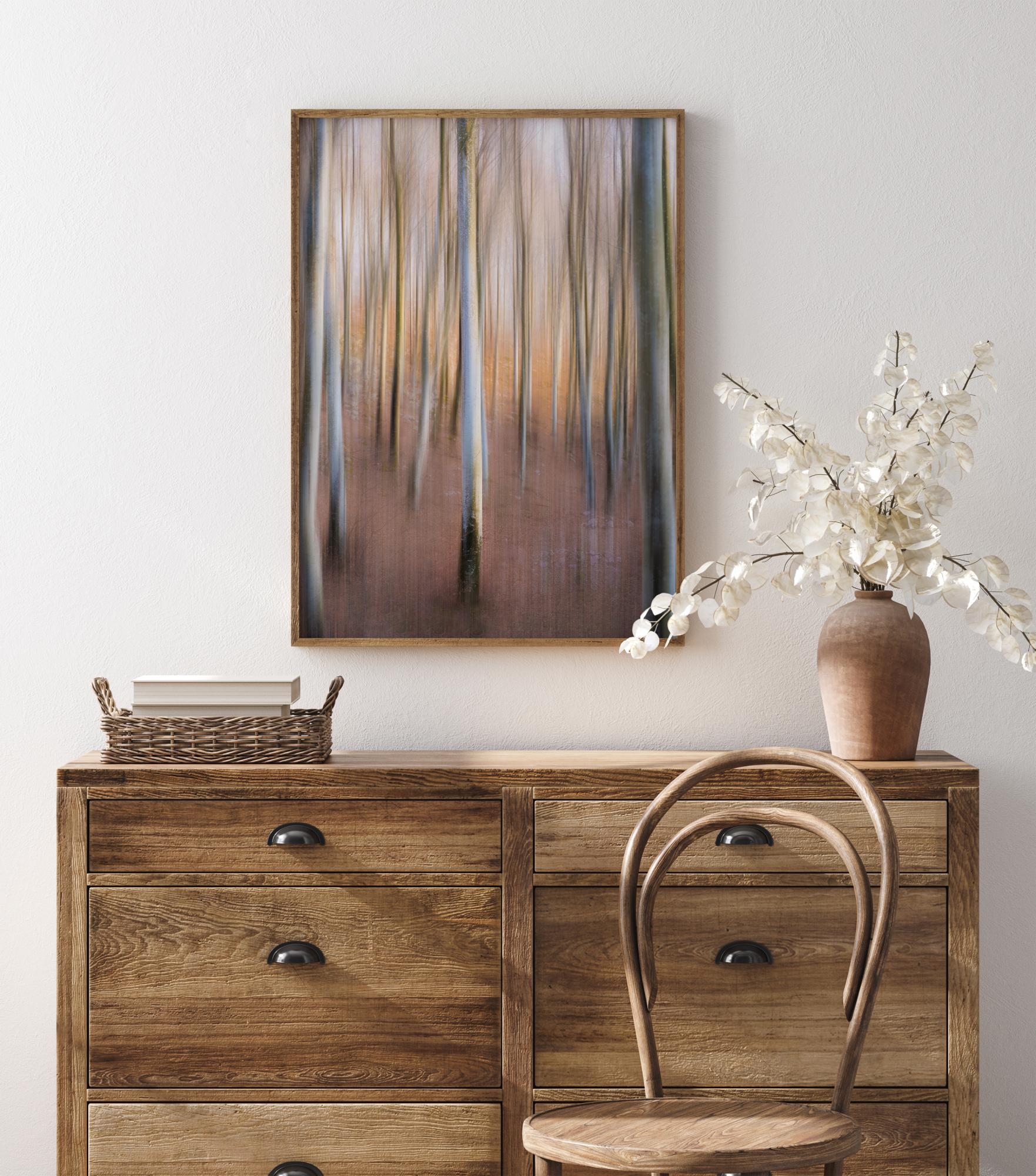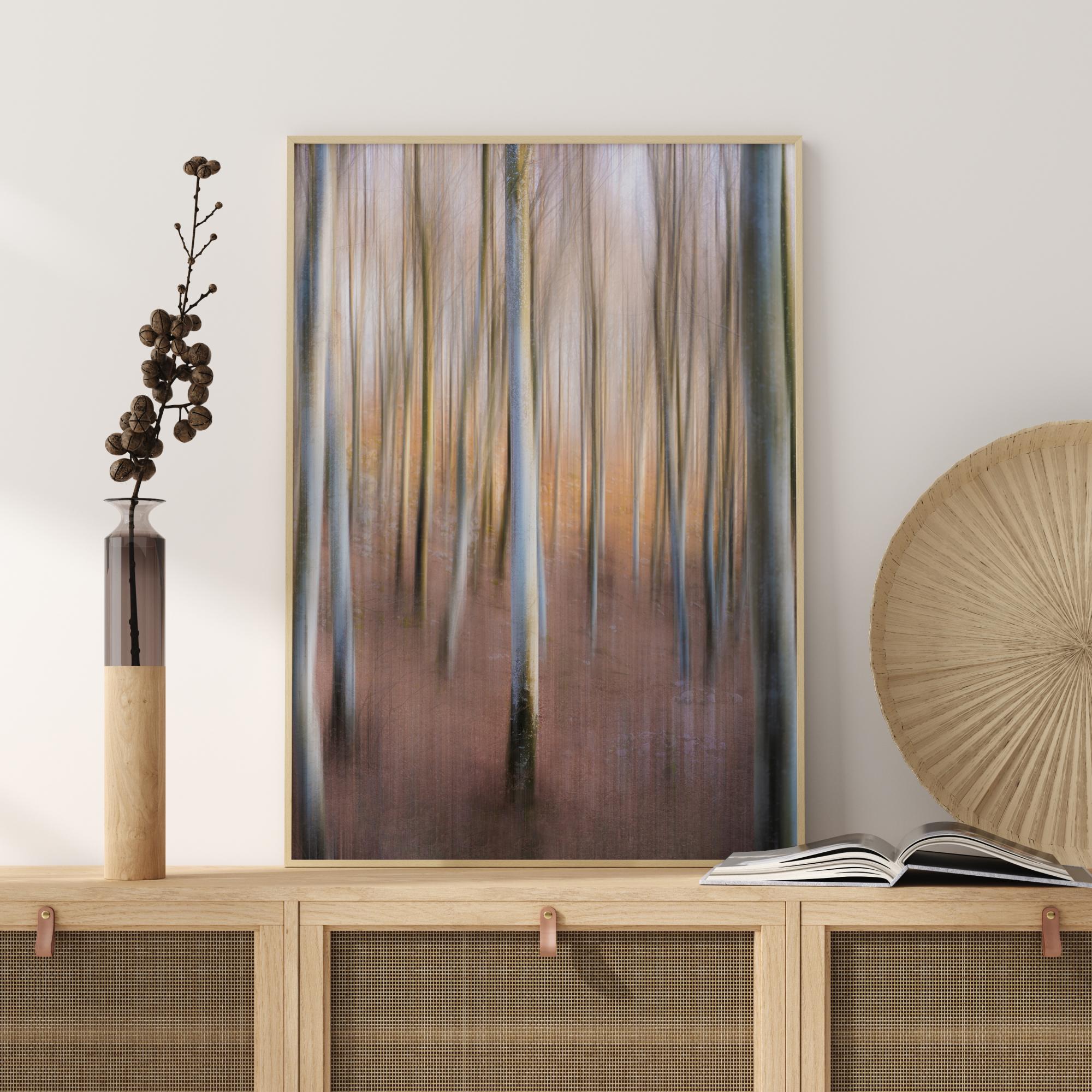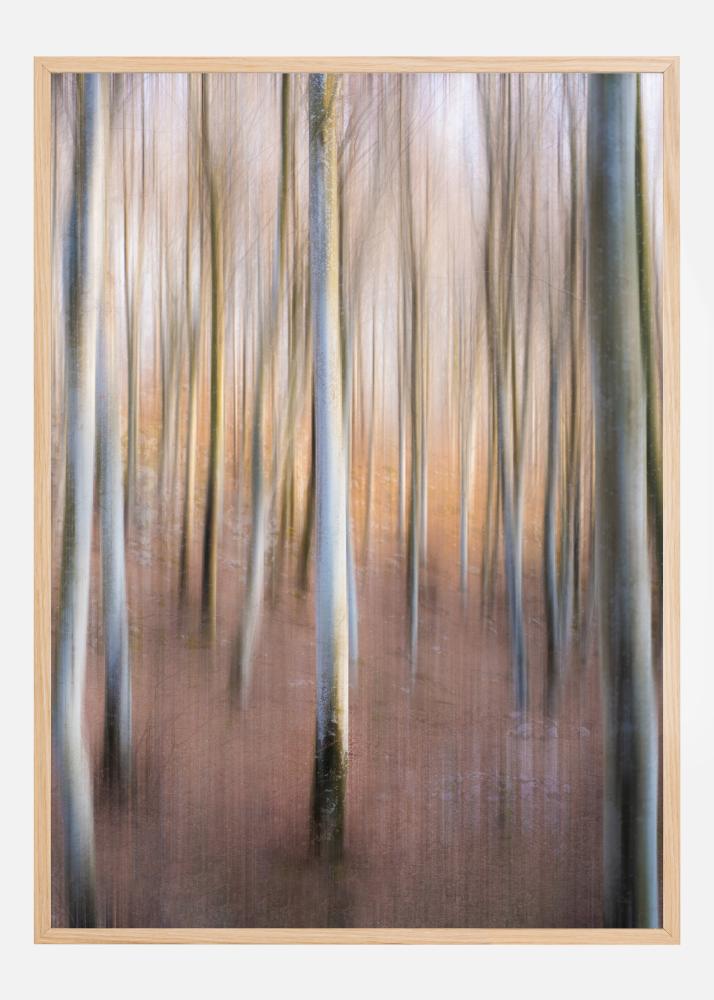 Prekrasan ali tajanstven poster s magičnom šumom. Prirodna svjetlost koja prolazi kroz drveće ističe magične pastelne boje visokih stabala. Čujte tišinu šume kada objesite ovu sliku u svom domu.