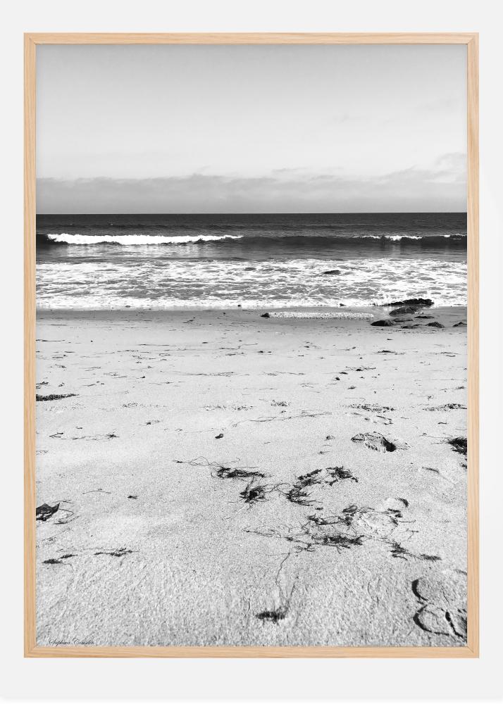 Prirodna fotografija u crno-bijeloj tehnici gdje pjenasti valovi prelijevaju mirnu plažu. Nekoliko laganih otisaka stopala u pijesku jedino su što nagovještava ljudsku prisutnost. Miran i harmoničan poster koji je stvorila fotografkinja Saphira Consilio.