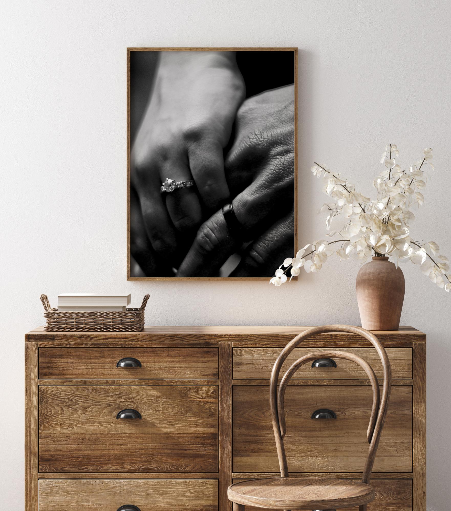 Romantičan crno-bijeli otisak dviju ruku koje nose prstenje. Snažna i emocionalna slika na tamnoj pozadini. Prirodno svjetlo osvjetljava mali prsten sličan dijamantu. Romantičan poster za objesiti na zid u spavaćoj sobi.