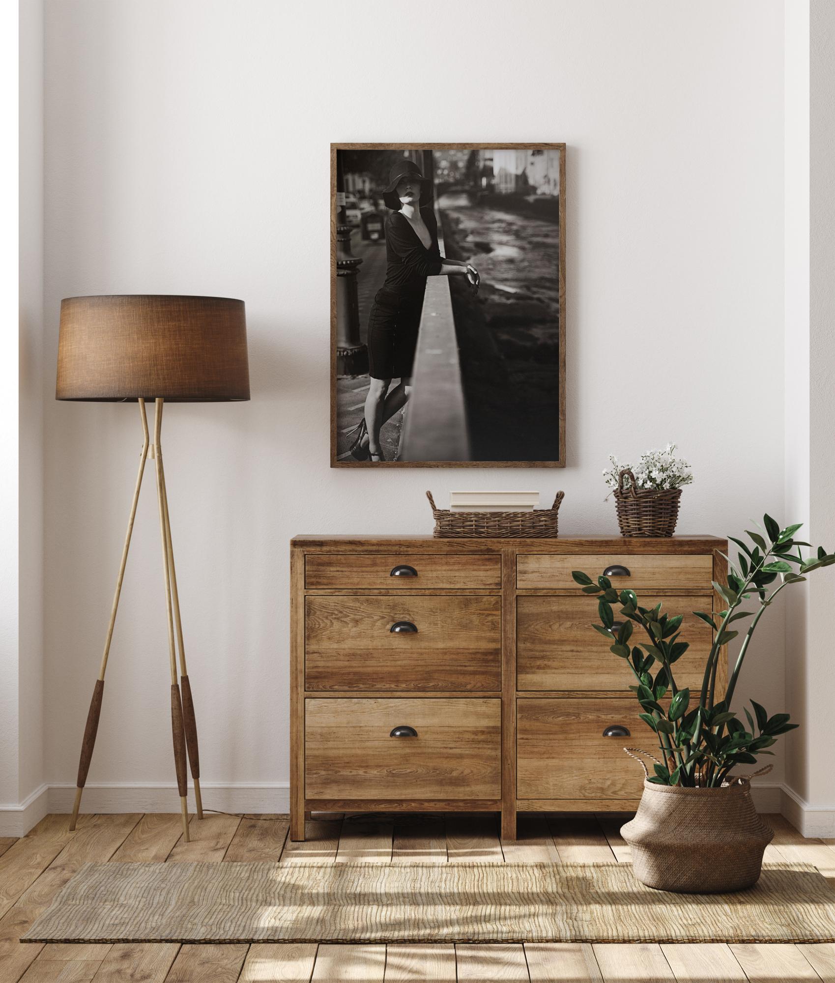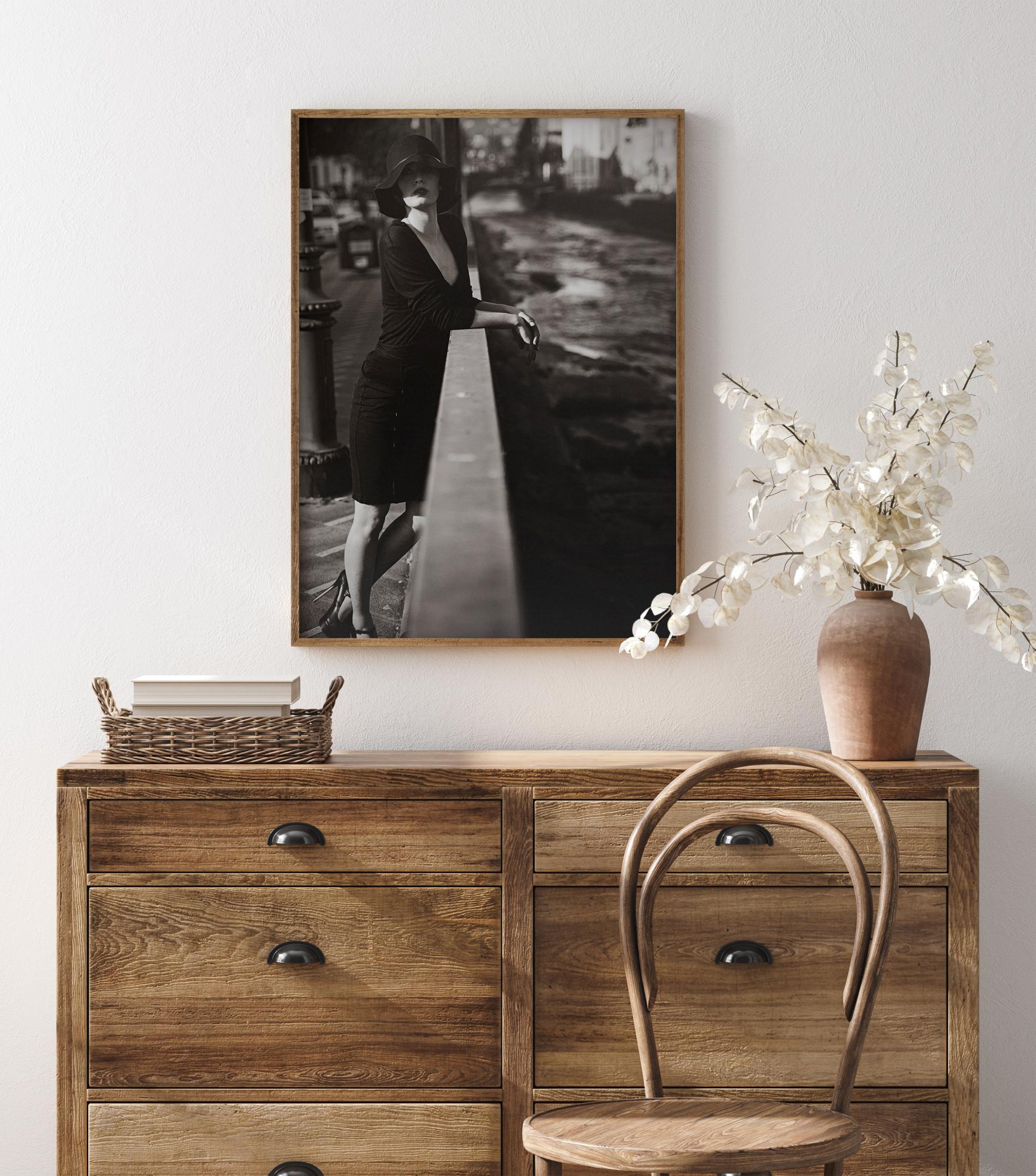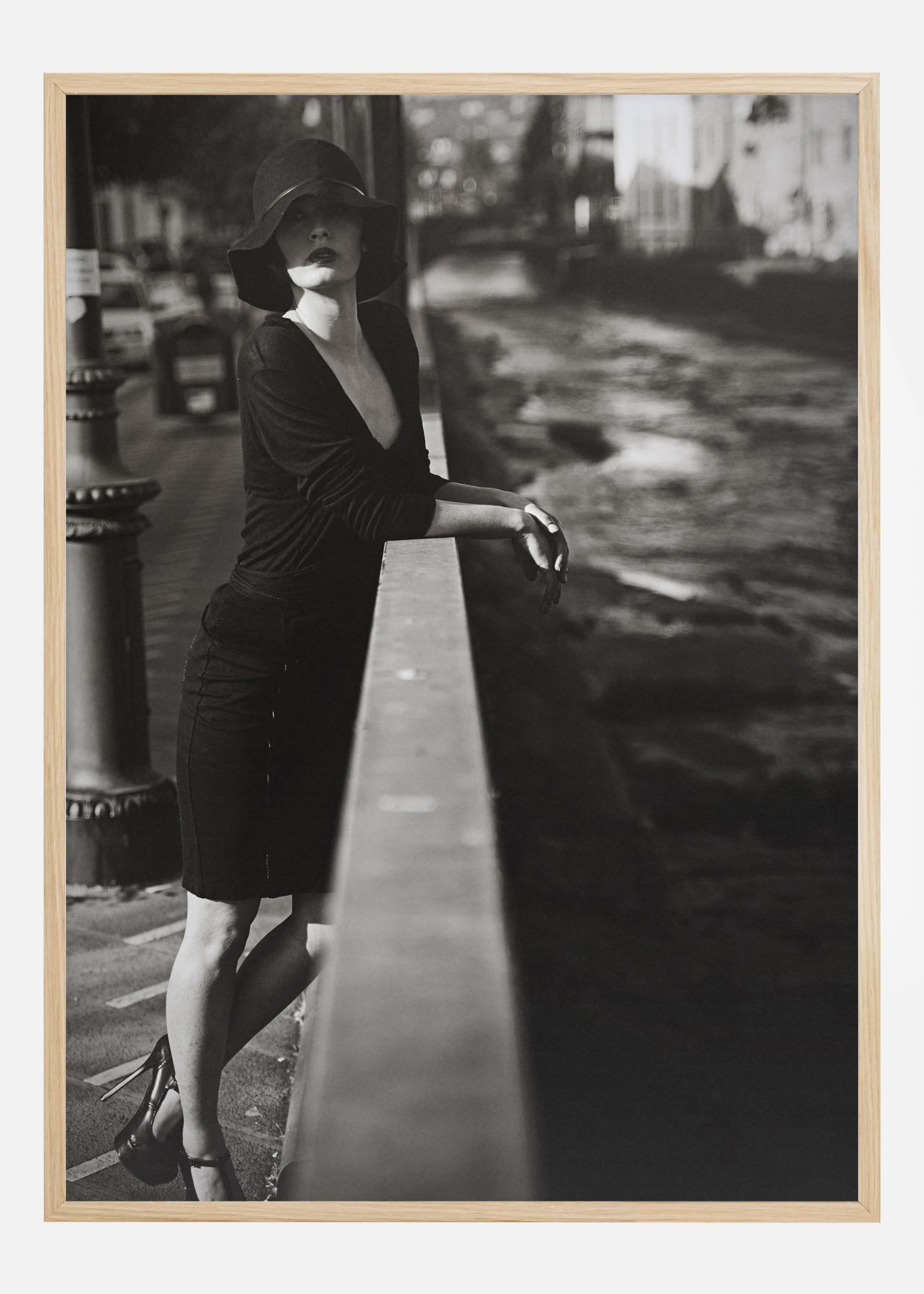 Portret žene koja se naslanja na zid. Ova fantastična fotografija odiše klasom i hvata opuštenu eleganciju kao ništa drugo. Postavite ovaj poster na zid kako biste dobili ugodan osjećaj 30-ih godina.