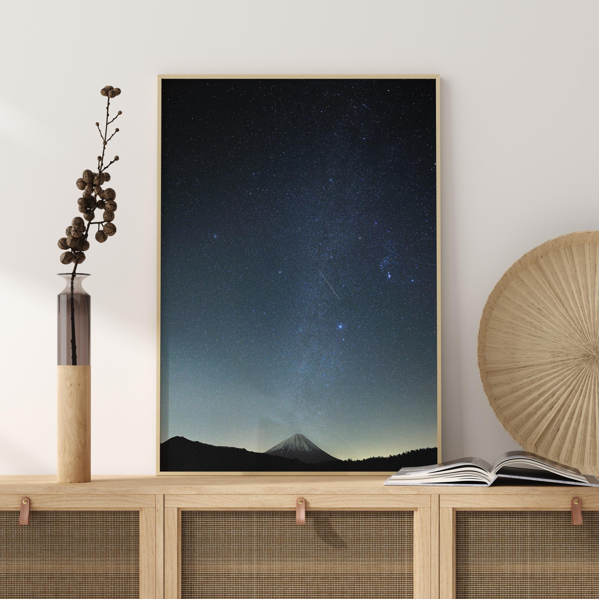 Lijep poster s noćnim nebom i meteoritom. S planinom prekrivenom snijegom koja se vidi u daljini, postoji mističan osjećaj nad magičnim bijelim zvijezdama. Zraka prirodne svjetlosti svijetli iza planine i stvara magičan i mističan osjećaj. Savršeno za dječju sobu.