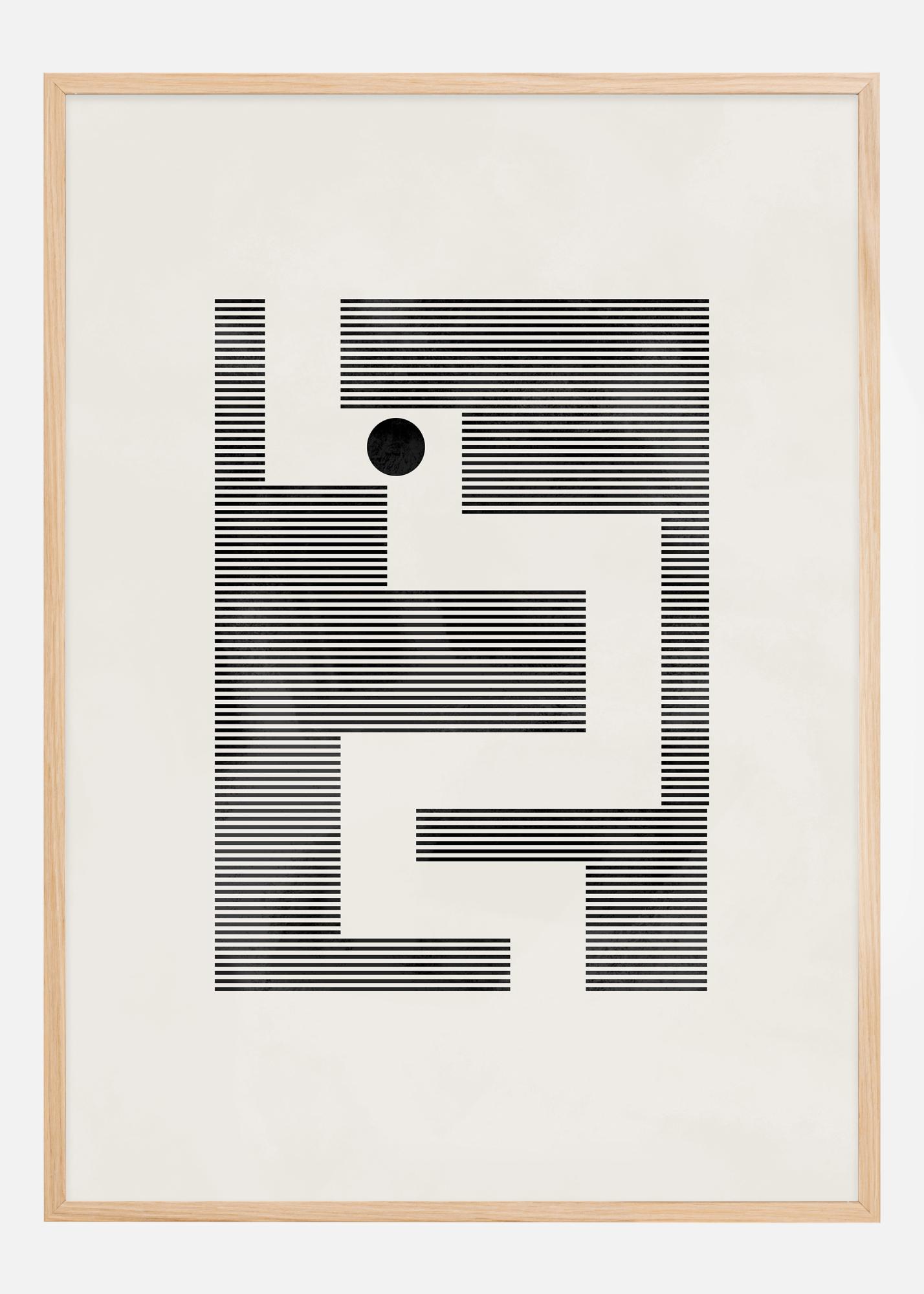 Ovaj umjetniÄki plakat nudi minimalistiÄko tumaÄenje labirinta, izvedeno s crnim linijama koje oblikuju složenu mrežu geometrijskih oblika na krem pozadini. Usamljeni crni krug smjeÅ¡ten u srediÅ¡tu labirinta djeluje kao vizualna toÄka sidriÅ¡ta, istovremeno dodajuÄi dubinu i fokus inaÄe jednostavnom motivu. Ovaj dizajn se poigrava s promatraÄevim okom i potiÄe na vizualno istraživanje njegovih puteva i slijepih ulica.