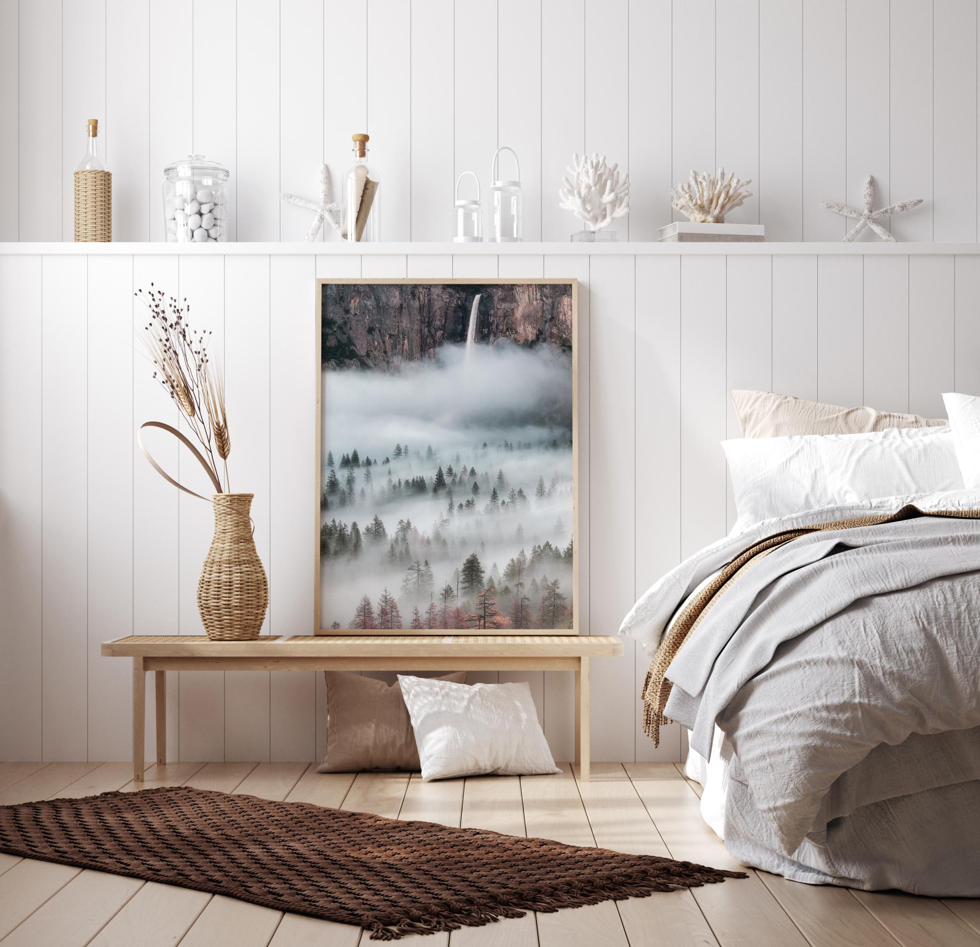 Prekrasna fotografija maglovitog planinskog obronka s nekoliko stijena i spektakularnim vodopadom u pozadini. Oblakovita magla mirno lebdi i daje osjećaj svježeg jutra koje uljepšava vaš dom. Prekrasne jesenske boje i lebdeća magla daju osjećaj mistike.