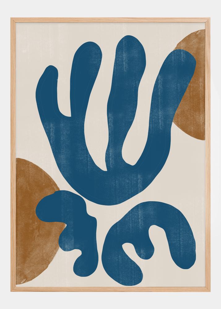 Ovaj živopisni poster kombinira hrabre oblike i zemljanu paletu boja kako bi stvorio dojam i moderne umjetnosti i čudesa prirode. Velike, lepršave plave forme prizivaju misli o vodi ili vegetaciji, dok oker detalji doprinose toplom i prirodnom kontrastu. Ovaj dizajn izvrsno prikazuje kako apstraktna umjetnost može oponašati i slaviti organski uzorci našeg svijeta.