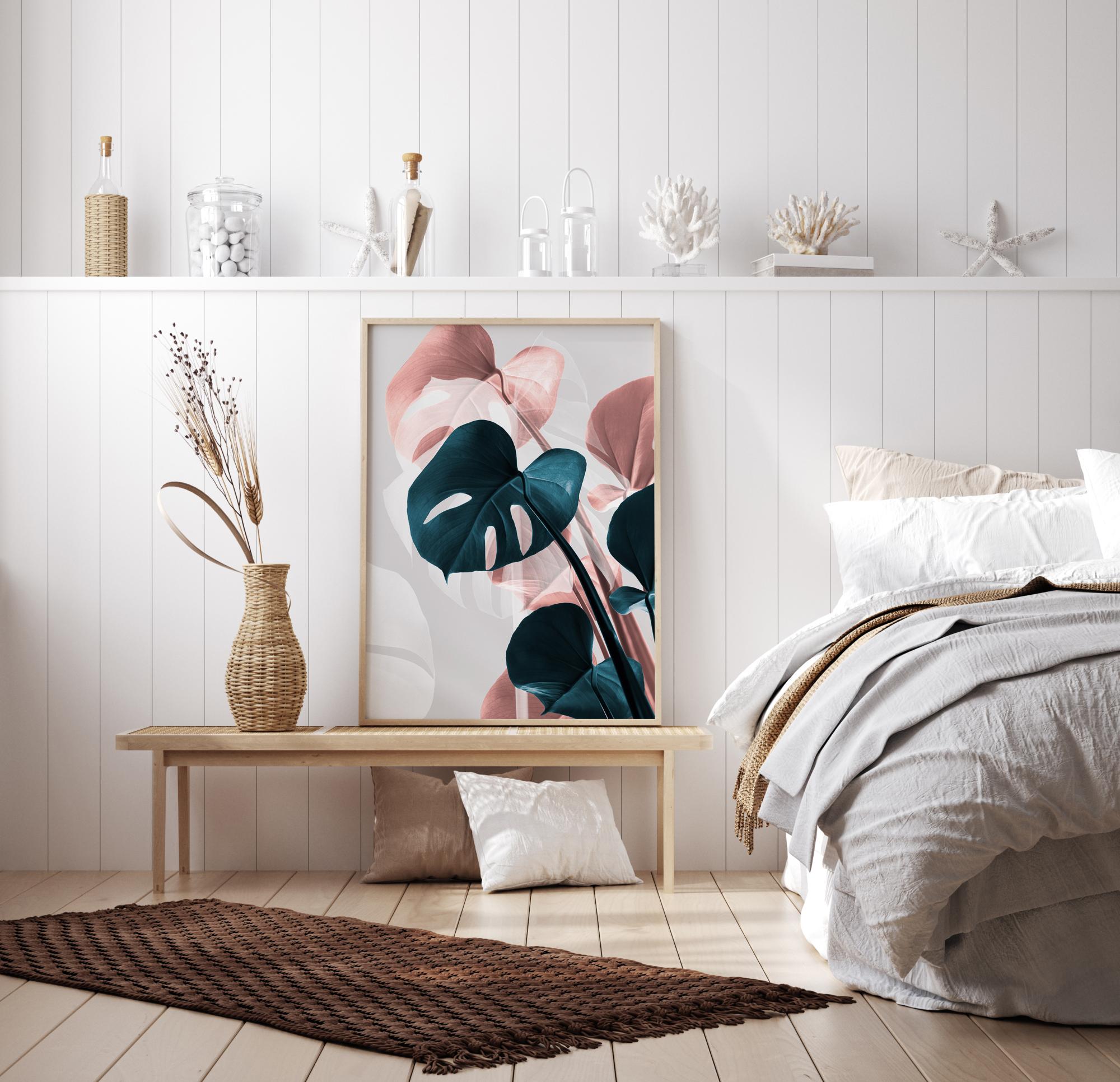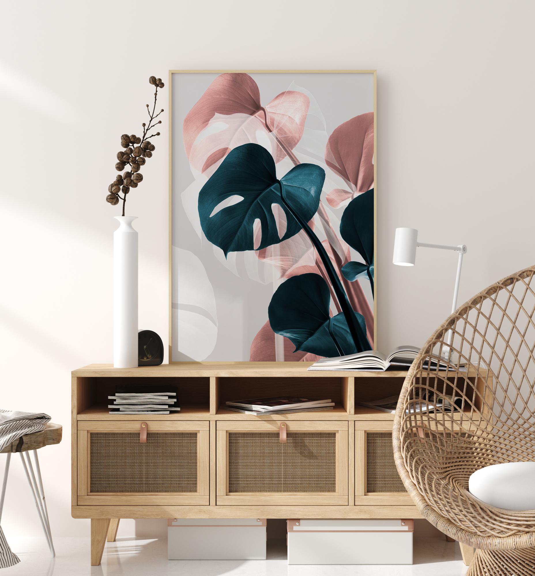 Prekrasan poster s ružičastim i tamnozelenim listovima monstere koji prikazuju savršenu kreativnost u listovima. Na pozadini boje bež, srcoliki listovi sjaje svojim prekrasnim zelenim i ružičastim listovima. Oblici u obliku listova daju uzbudljiv osjećaj vašem domu.