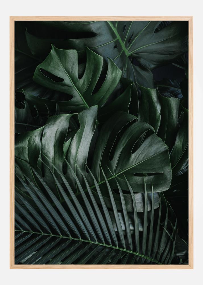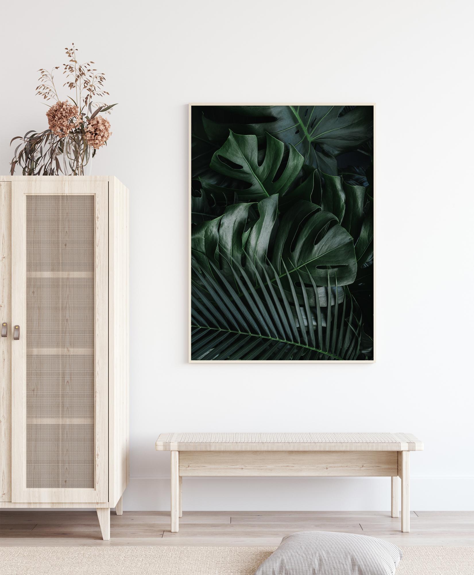 Listasti portret zelenih listova Monstere i palminih listova. Prirodno svjetlo osvjetljava gornje listove monstere i stvara tamnije nijanse u gornjem dijelu otiska. Listovi nalik na sjekiru stvaraju topao opuštajući osjećaj. Savršen poster za sve koji vole biljke.