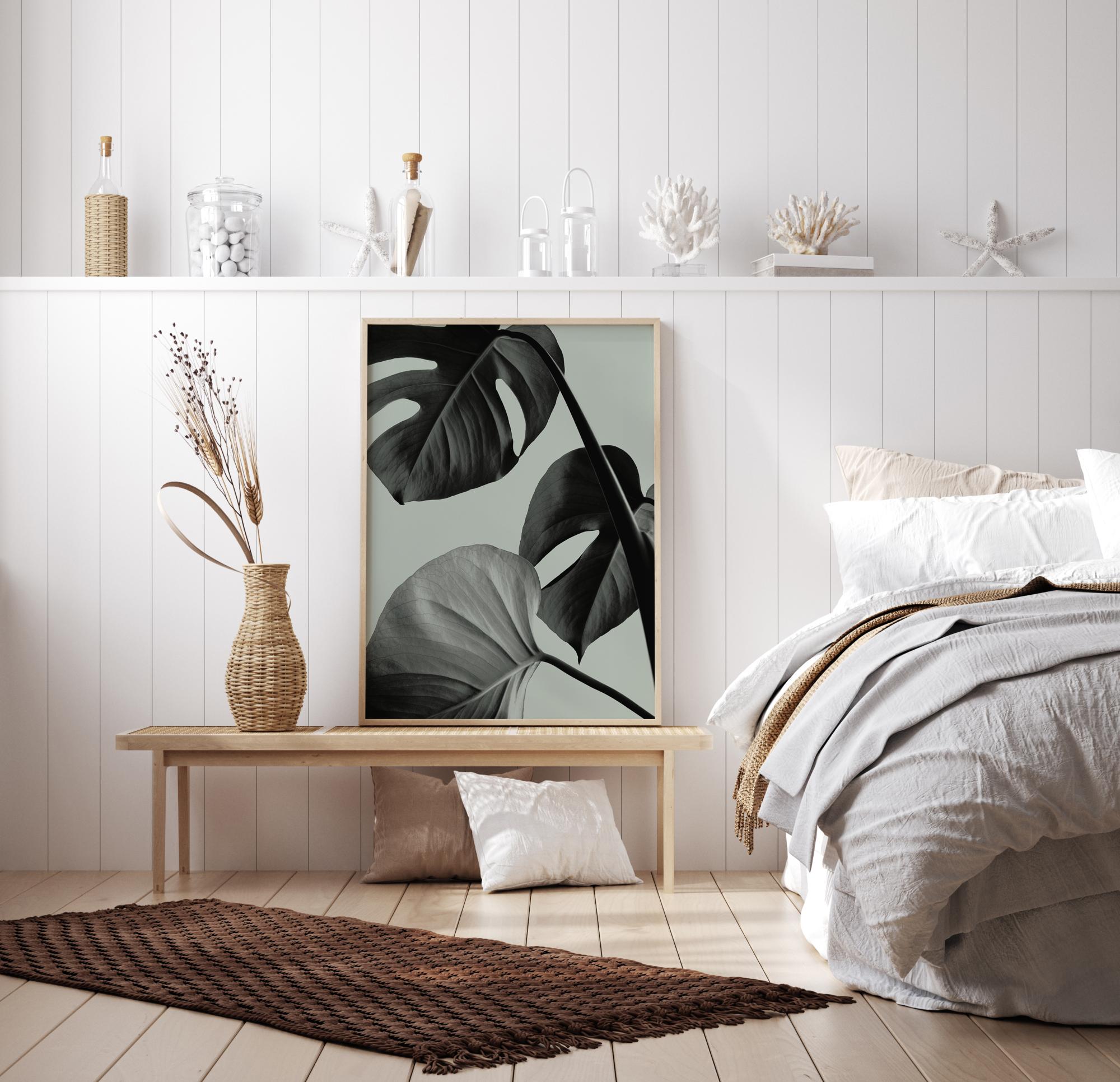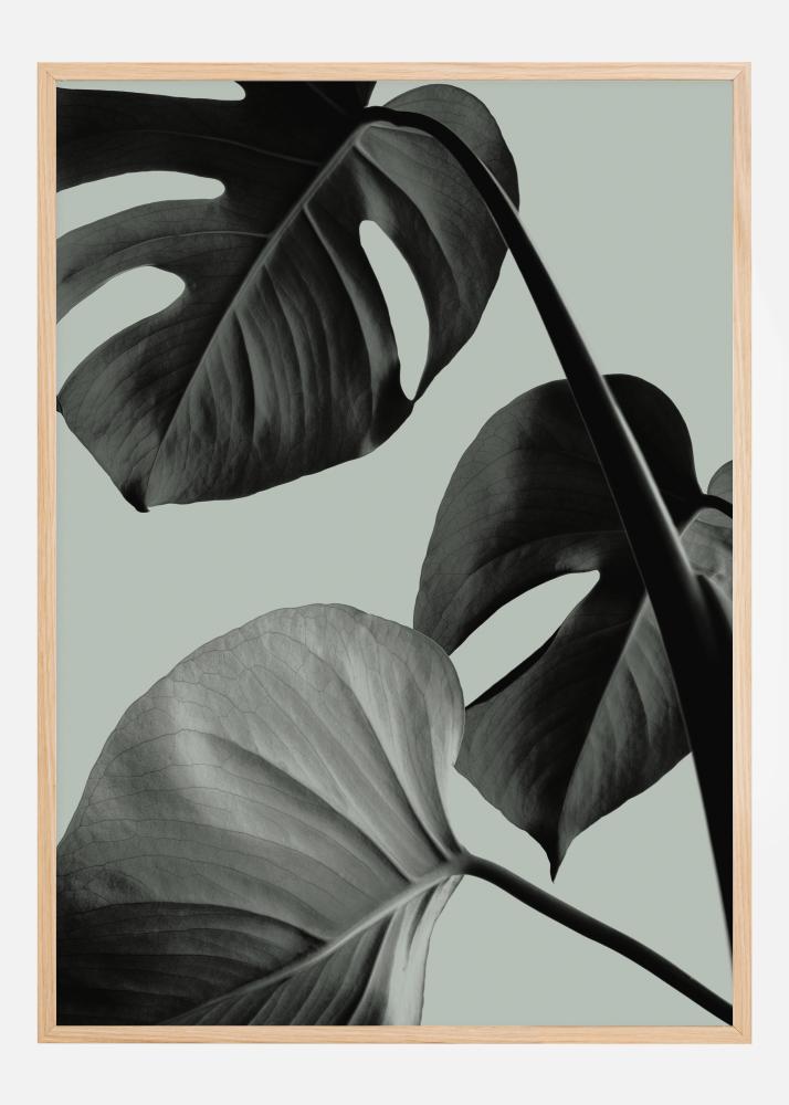 Fantastičan crno-bijeli poster izbliza s tri lista monstere koji svojim oblikom srca prekrivaju mat siva pozadina. Listovi s oblikom pile imaju oči slične oblike koji im daju savršeno divlji osjećaj. Dajte svom domu uzbudljiv osjećaj budući da oblici slični očima pomalo su zastrašujući.