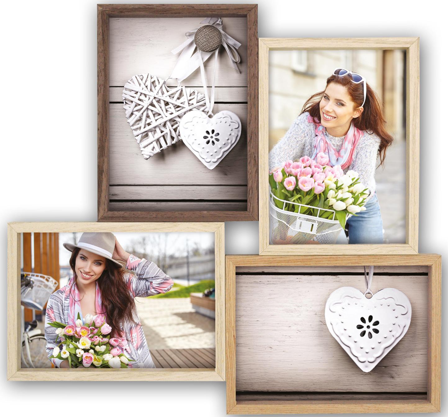 Lijep okvir kolaža od drva s četiri okvira u različitim nijansama. Ovaj okvir ima prostor za 4 slike veličine 13x18 cm. Ovaj okvir ima vrlo elegantan izgled koji ga čini prikladnim za mnoge domove i jednostavnim za kombiniranje s drugim slikama i zidnim ukrasima na vašem zidu. Vanjske dimenzije okvira su 39,5x37,5 cm. Zidni nosač je uključen.