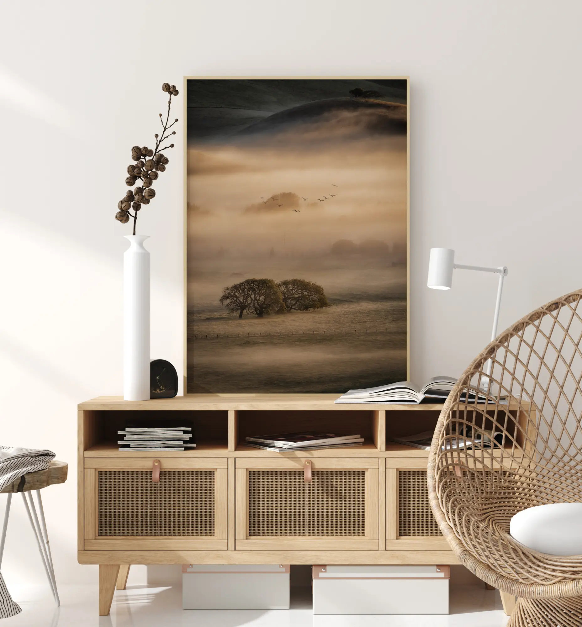 Zapanjujuća fotografija maglovitog jutra na padini planine s pticama koje lijepo parade žutim oblakom. Mekani smeđi tonovi na posteru stvaraju opuštajuću atmosferu u kojoj gotovo možete osjetiti svježinu prirode. Unesite ljepotu prirode u svoj dom s ovom prekrasnom jutarnjom čarolijom.