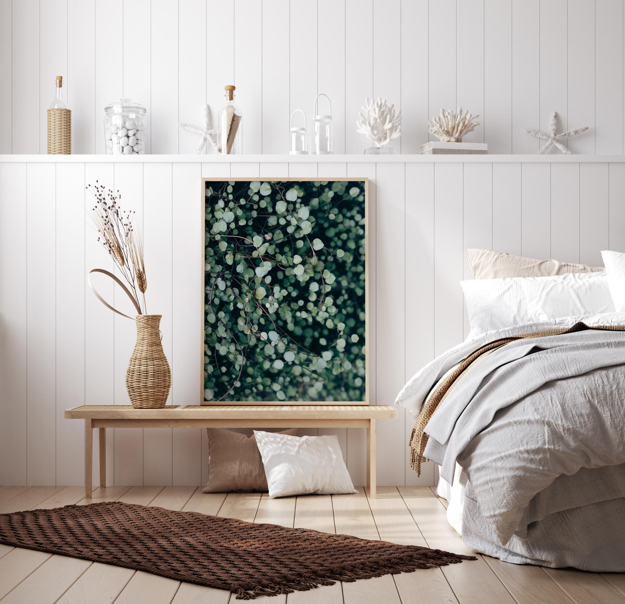 Prekrasan zeleni plakat izbliza s potezankom sa svojim mnogobrojnim lišćem i granama. Mali, okrugli listovi sjaje veselo na suncu. Crna pozadina čini da lišće posebno dobro dolazi do izražaja. Objesite ovaj tisak na svijetlozeleni zid kako biste dobili umirujući dodir u prostoriji.