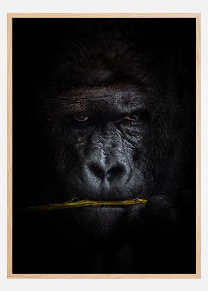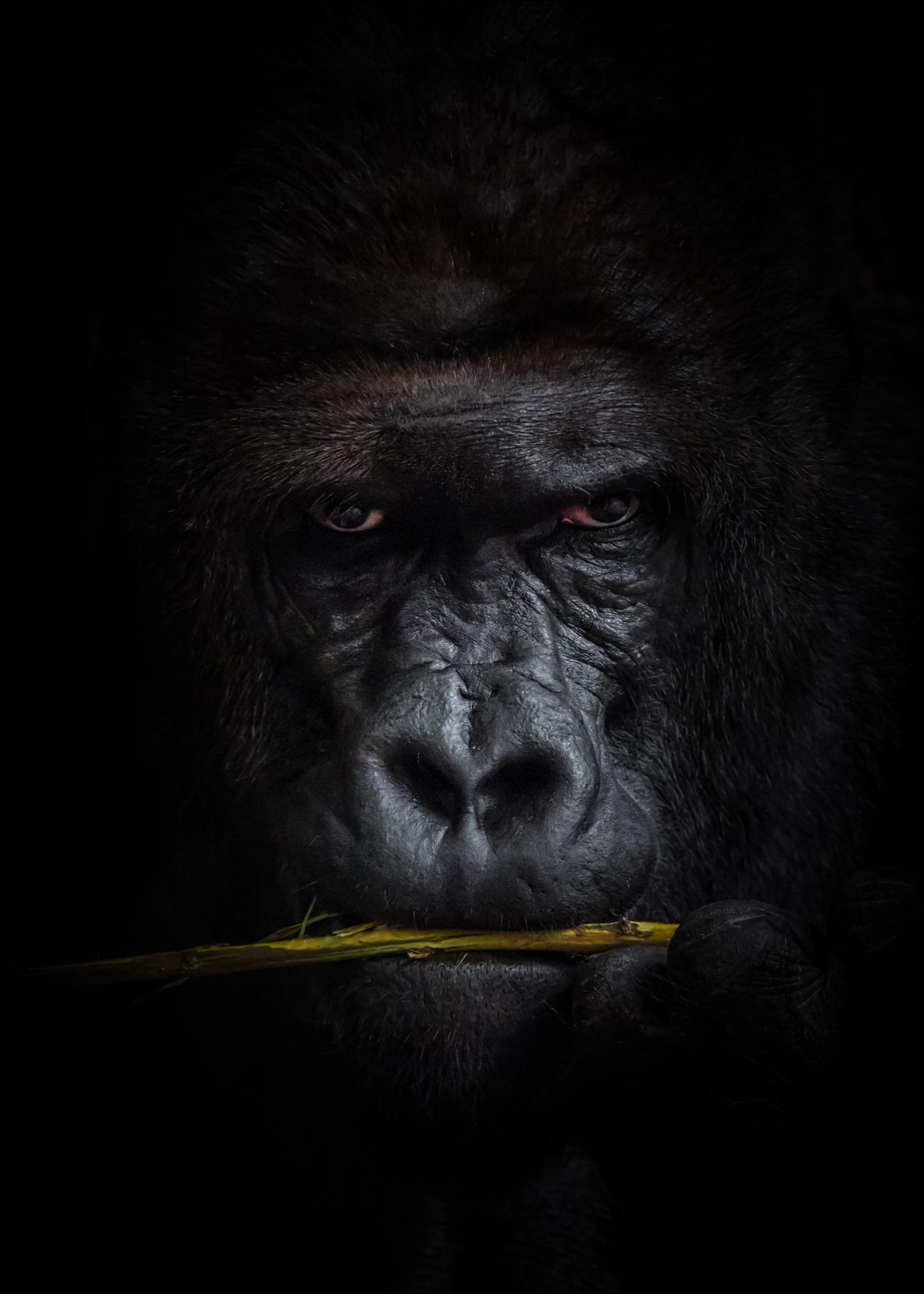 Bliski portret gorile koja gricka koru s grane. Pogled je usmjeren prema fotografu, a tamno krzno se stapa s crnom pozadinom stvarajući prekrasnu dubinu motiva. Moćan poster s intimnim susretom s jednom od najvećih primata prašume.