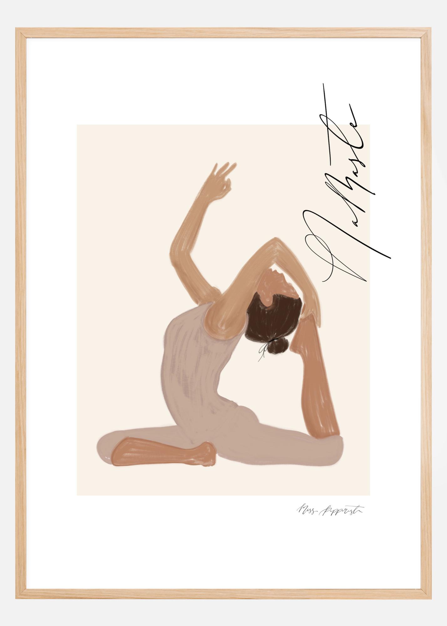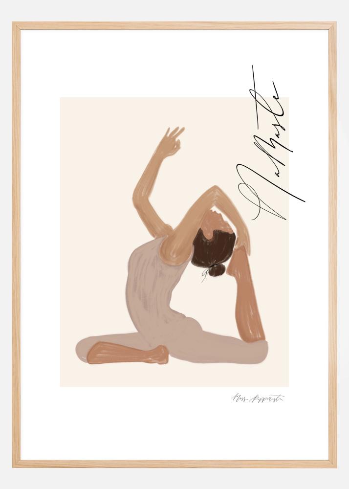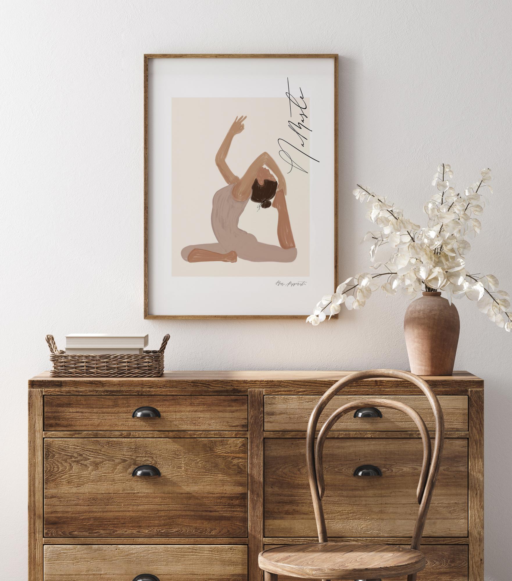 Grafički plakat u nježnim pastelima, prikazuje ženu u joga položaju s porukom "Namaste" (Klanjam se tebi) u prekrasnoj kaligrafiji. Harmoničan i miran motiv uokviren i istaknut s bijelim širokim paspartuom, kreirao Jenny Skantz, Miss Papperista.