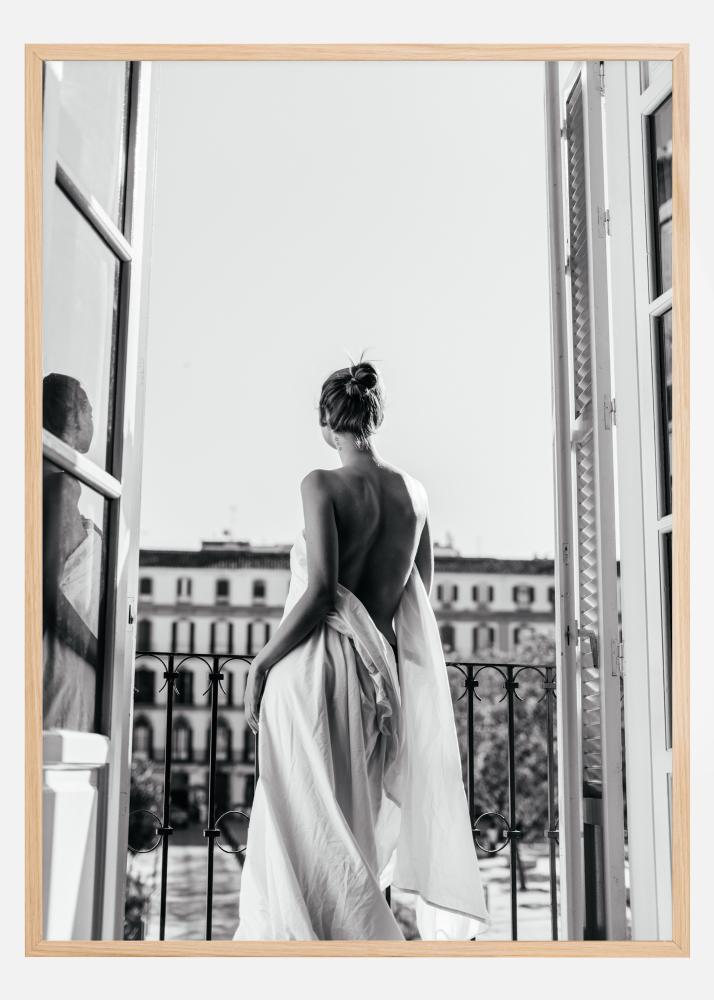 Seksi crno-bijeli plakat izbliza s ženom koja stoji na balkonu u bijelom ručniku. Sa zavezanom kosom u čvor, čini se da žena uživa u pogledu. Odsjaj žene u prozoru stvara senzualni dojam. Ovo je senzualna i lijepa slika za objesiti na zid vaše spavaće sobe.