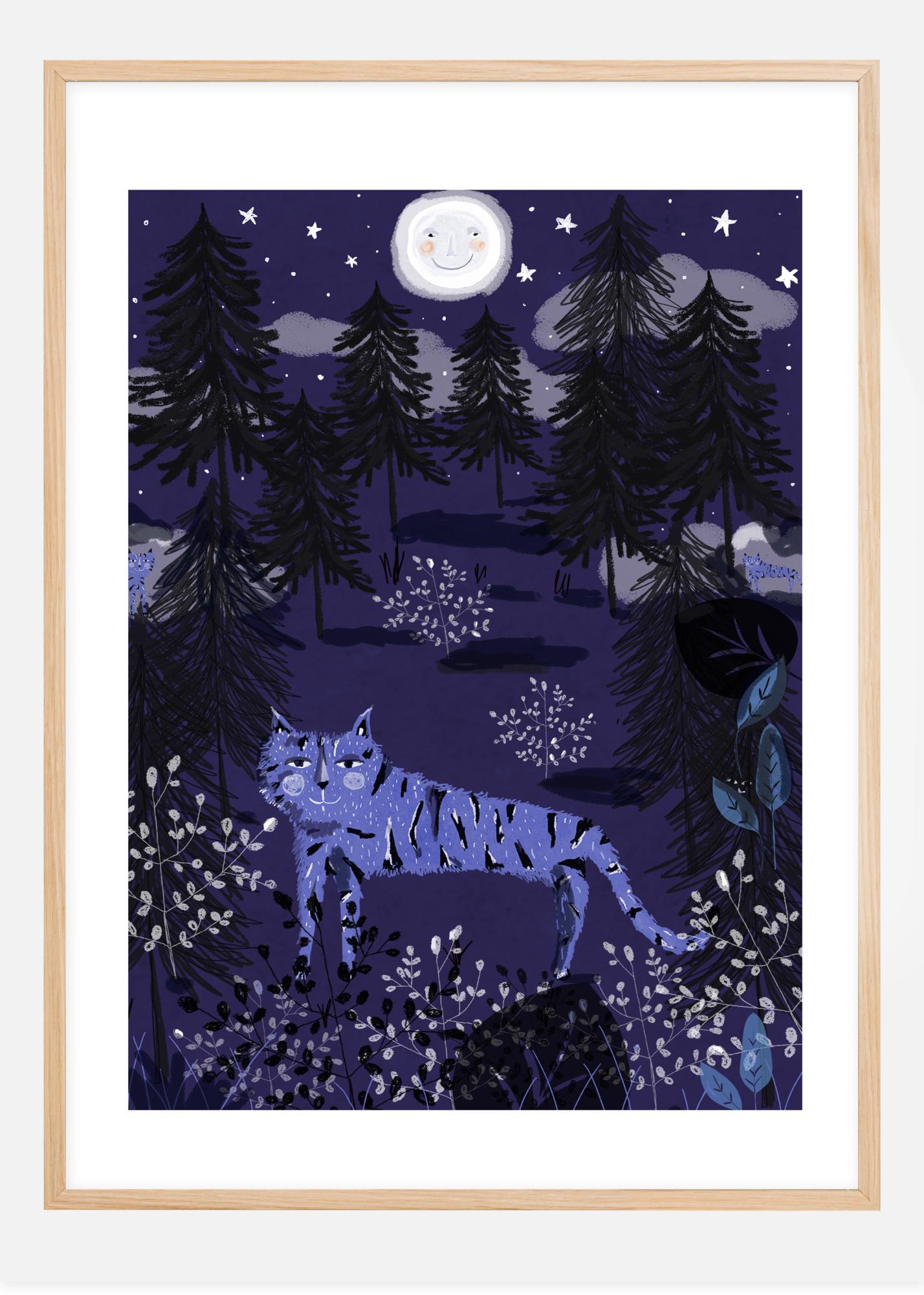 Zabavan poster koji prikazuje šumu noću s nasmijanim mjesecom i tigrom. Ljubičasto nebo ispunjeno je oblacima i sjajnim zvijezdama. U pozadini, borovi stoje visoko dok ih mjesec gleda. Tamne ljubičaste i zelene boje stvaraju topao osjećaj, dok mali bijeli grmovi daju slici to malo dodatnog svjetla. Savršena slika za dječju sobu.