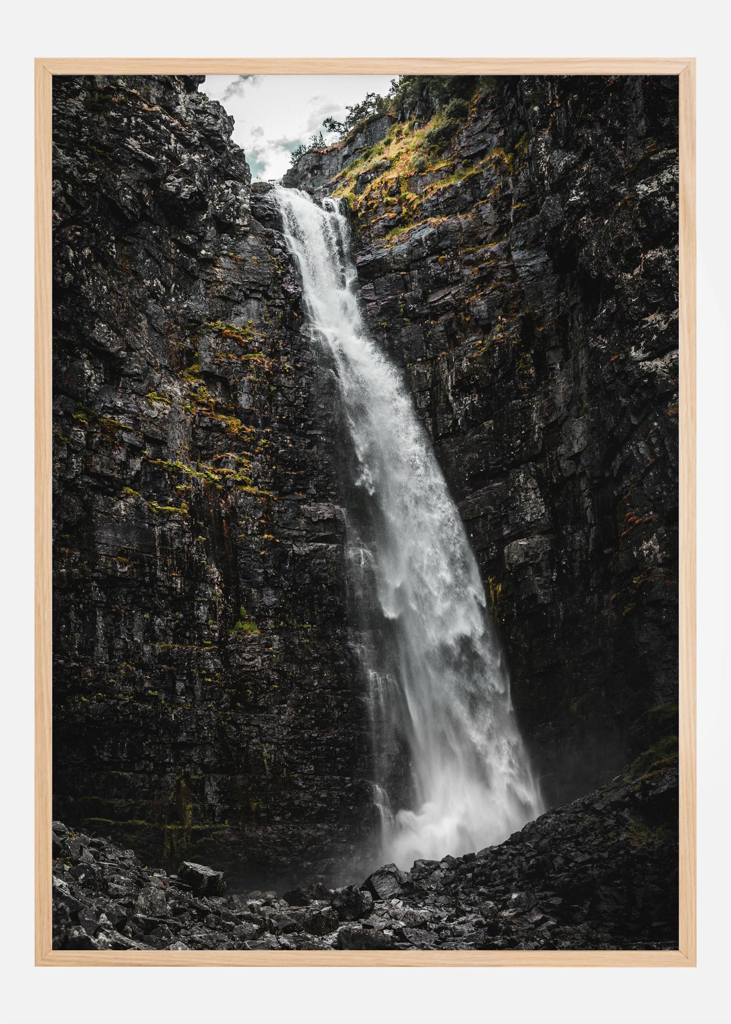 Ovaj sugestivni poster prikazuje Njupeskär, najviši vodopad u Švedskoj, koji dramatično teče niz stjenovitu liticu. Otisak prikazuje snažan pokret vodopada i hladnu, bistru vodu koja se sudara s kamenjem ispod. Vodopad je okružen tamnim, gotovo crnim stijenama koje su u kontrastu s bijelom pjenom, dok se nježno zelenilo hvata za površine kamenja. Ovo je poster koji donosi osjećaj sirove snage i ljepote prirode i idealan je dodatak za svakoga tko cijeni čuda prirode.