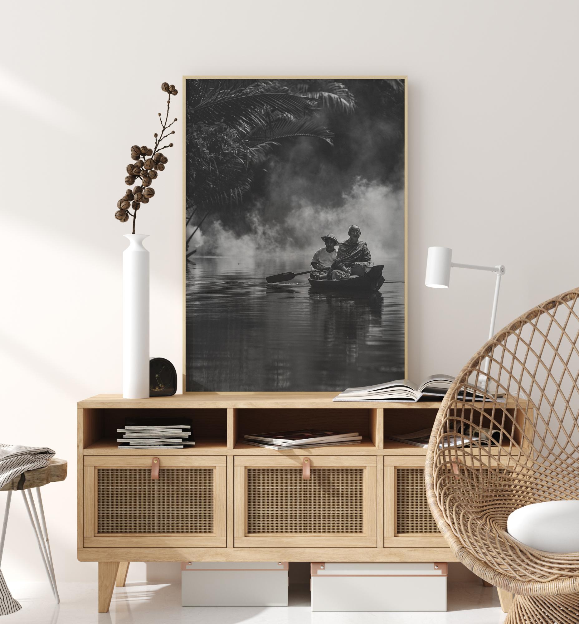 Mirni crno-bijeli krupni plan fotografija dvaju muškaraca koji putuju rijekom. Dva muškarca mirno sjede na svojem tajlandskom gondolskom ribarskom čamcu i promatraju svoju okolinu. Prirodna sunčeva svjetlost koja sija kroz oblake reflektira čamac na vodi. Gotovo možete čuti tišinu na ovom plakatu. Savršeno za mirno okruženje.