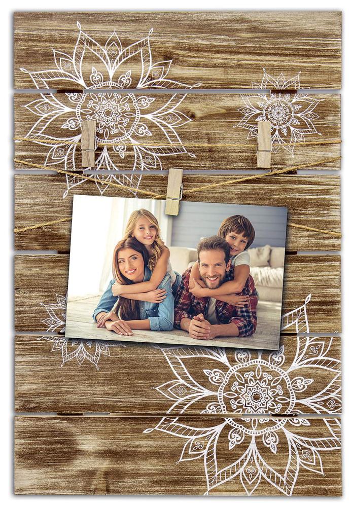 Ovo je lijepi okvir za kolaž gdje su slike priÄvrÅ¡Äene ukrasnim drvenim Å¡tipaljkama. Slike su priÄvrÅ¡Äene na pozadinu od drveta s bijelo obojanim cvijeÄem u boemskom dizajnu. Okvir ima mjesta za dvije slike veliÄine 10x15 cm. Vanjske dimenzije okvira mjere 32x48,5 cm. Ovaj okvir za kolaž može se lijepo kombinirati na zidu s drugim slikama kako bi se stvorila stilizirana cjelina u vaÅ¡em domu. Zidni nosaÄ je ukljuÄen.