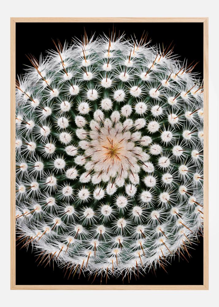 Prekrasna fotografija iz zraka kaktusa s bijelim cvjetovima. Na crnoj pozadini ističe tamnozelena boja bijele cvjetove i šiljaste bodlje. Središnji dio biljke ima lagani žuti ton, što daje dodatnu boju tisku. Savršen poster za sve koji vole biljke.