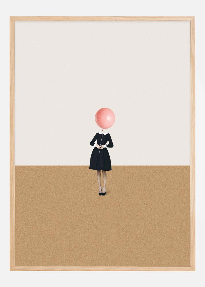 Ovaj umjetniÄki plakat privlaÄi pogled svojom jednostavnom, ali snažnom slikom žene odjevene u crnu haljinu, koja stoji sama nasuprot pozadini toplih pjeÅ¡Äanih tonova. Ona drži ono Å¡to izgleda kao savrÅ¡eno sferiÄni, ružiÄasti balon iznad svoje glave, stvarajuÄi vizualni i misaoni kontrast izmeÄu osobe i okolne povrÅ¡ine.